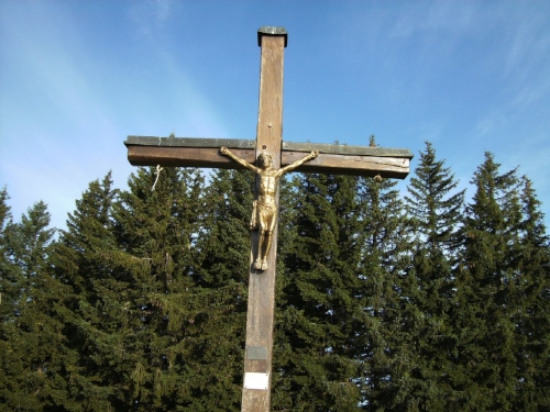 Vor mir sehe ich einen Trailer, der einen Wanderer um Wasser anbettelt. Der hilft aus und begleitet den Läufer auf den letzten Höhenmetern nach oben. Wir verlassen den Wald und dann sehe ich das Gipfelkreuz nach zwei, drei Kehren vor mir.