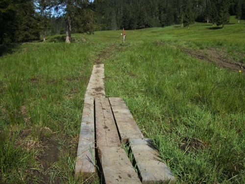 Kurz hinter Kilometer 30, der befestigte Fahrweg endet, freut es den richtigen Trailer, denn Grasweg folgt. Später würde es auch Kinder freuen, denn Richtung Rohrmoos laufen wir dann über Bohlen, die das Versinken im Sumpf vermeiden sollen. Aber da schon einige Läufer voraus sind, ist der Boden entsprechend aufgeweicht. Unser Schuhputz leidet gehörig. Besonders bei jenen, die auf den rutschigen Brettern den Halt verlieren. Und dann hat der Schuh eine Einheitsfarbe – braun! Wer noch mit seinem hinteren Körperteil den Boden berührt, der muss dann Spott aushalten können.