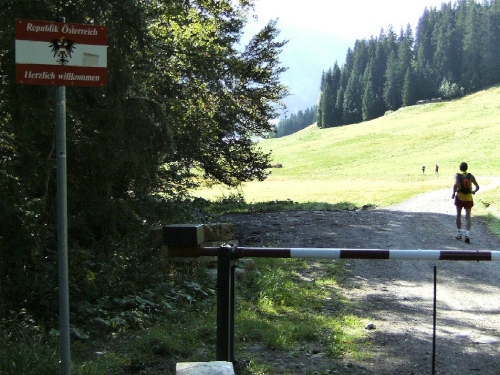 Dann folgt eine Schranke und links zeigt ein Schild, dass wir in Österreich angekommen sind. Herzlich willkommen, so werden wir begrüßt.