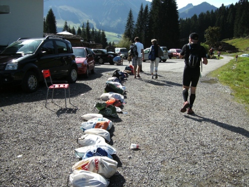 Beim Gasthof Hörnlepass gibt es wieder Vollpension. Es wird zugegriffen. Ach ja, die zwei, drei Minuten für eine gescheite Nahrungsaufnahme sollte man sich schon gönnen. Denn im Vorbeilaufen sich was greifen, das ist sicherlich zu wenig. Gleich nebenan liegen die Rucksäcke mit der Wechselbekleidung.