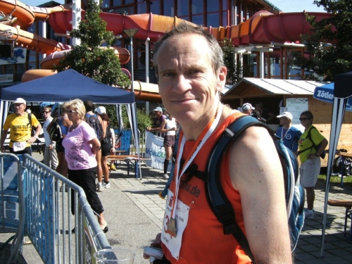 In Hofen sehe ich eine Kapelle am Ortseingang und dann werden wir Richtung Beilenberg eingewiesen. Nach rund 200 Meter auf der Straße geht es über eine kleine Rampe in das Tal des Schwarzenbach, immer weiter bergab. Wir verlassen den Wald an der Wassertretanlage. Es geht auf der Straße über das Bahngleis und um das Zielgelände herum, wo jeder Finisher herzlich willkommen geheißen wird. Ja, schon ein hartes Rennen.