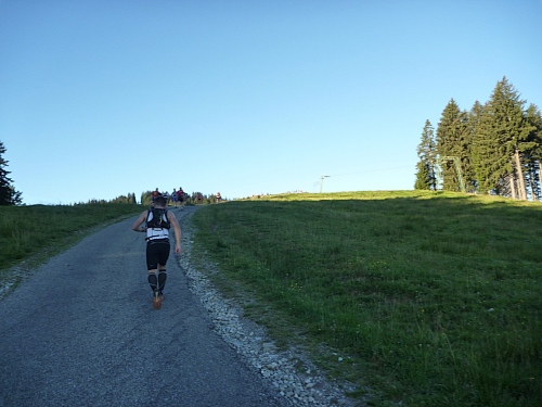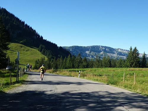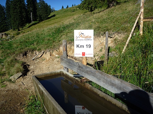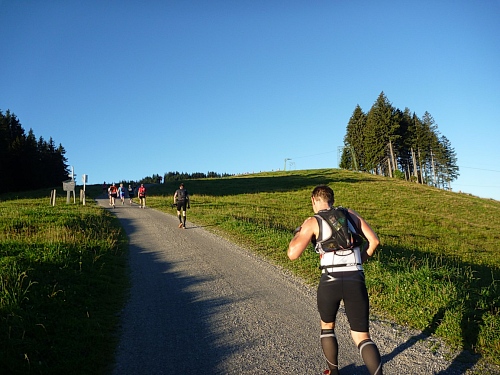 Entlang der Iller ist es noch einfach zu laufen, der Grünten spiegelt sich im Baggersee, doch viel zu schnell beginnt die Steigung, Bihlerdorf, Hüttenberg und der Schweiß rinnt.