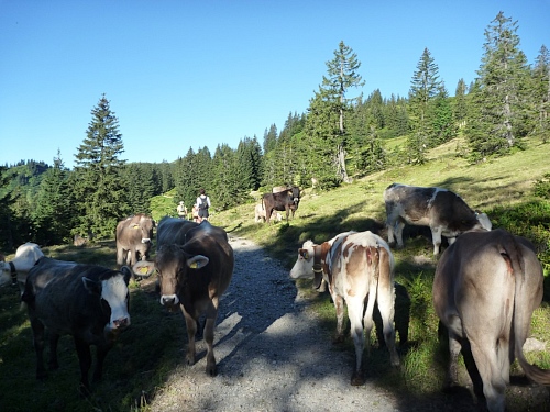 Fahnengehrenalpe, von Juni bis September bewirtschaftet. Doch Hirte Hans-Martin Jordan hat die Bar noch nicht eröffnet. Es ist viel zu heiß am frühen Morgen. Sigiswanger Horn (1527), Panorama, ja, ist vorhanden, aber wer kann es nun, um 9.30 Uhr, am Rande seiner Kräfte genießen?