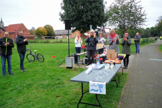 Am Fuße der Burg schlängelt sich die Alme lässig durch das Tal. Sollte man zumindest meinen, aber auch hier macht sich die Trockenheit der letzten Jahre bemerkbar, die kleinen Brücken überspannen meist trockene Flussbette. Etwas mehr als zwei Stunden sind vergangen, wir werden es jetzt ruhiger angehen lassen. Schließlich erwartet uns wenige Meter weiter eine ordentliche Steigung. Erst als wir Wewelsburg verlassen, werden wir wieder etwas schneller. Die Strecke führt relativ flach durch Felder und Wälder in Richtung Niederntudorf. Eine Inschrift auf dem Asphalt erinnert an das kleine Jubiläum der Veranstaltung (5 Jahre), die auch die virtuelle Ausgabe im letzten Jahr mit berücksichtigt. Gibt man Almetal-Marathon in Whats-App ein, wird daraus per Autokorrektur der Altmetall-Marathon. Dabei gehört der Lauf ganz und gar nicht zum alten Eisen, wie das Engagement der Helfer an der nächsten Verpflegungsstation eindrucksvoll beweist. Sie haben aber auch einen ganz besonders schönen Standort unter einem großen alten Baum.