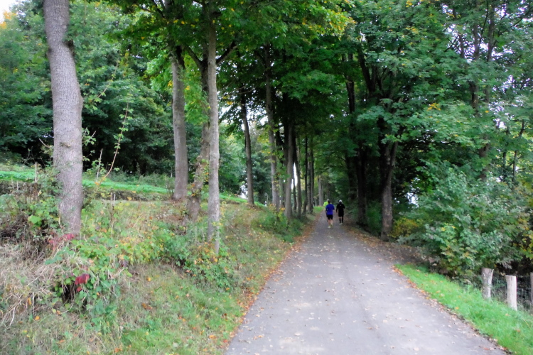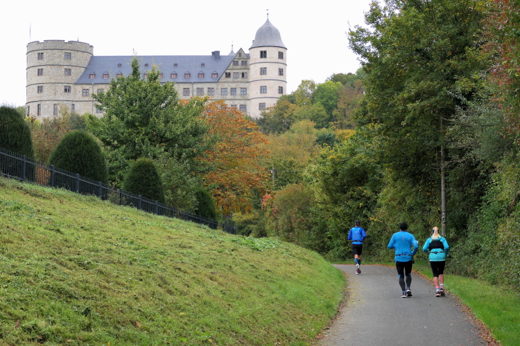 Frisch gestärkt durchmessen wir weiter das Almetal. Die Bäume sind noch erstaunlich grün, auch wenn sich die ersten goldgelb gefärbten Blätter dazwischen mischen. Silke begrüßt mich, lässig auf einer Bank hockend die Läufer/innen fleißig ablichtend. Die richtige Motivation zu dieser Zeit. Das kann die auf dem folgenden Hang thronende Wewelsburg auch nicht toppen, auch wenn diese die Halbmarathonmarke markiert. Interessant ist die historische Bedeutung der Burg. Anfang des 17. Jahrhunderts wurde die damals einzigartige Dreiecksburg von den Fürstbischöfen Paderborns errichtet. Später planten die Nazis, hier den "Mittelpunkt der Welt", das ideologische Zentrum der SS, zu errichten. Es gab gigantische Umbaupläne, die aber letztendlich nicht umgesetzt wurden. Das Kreismuseum Wewelsburg erinnert an die nationalsozialistische Vergangenheit.