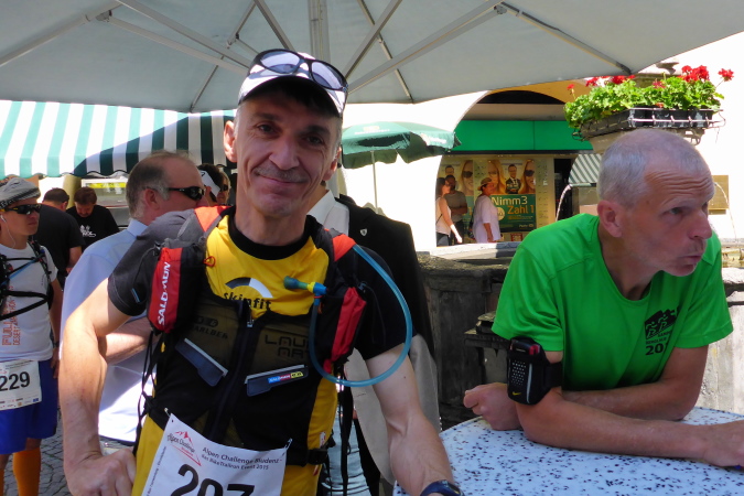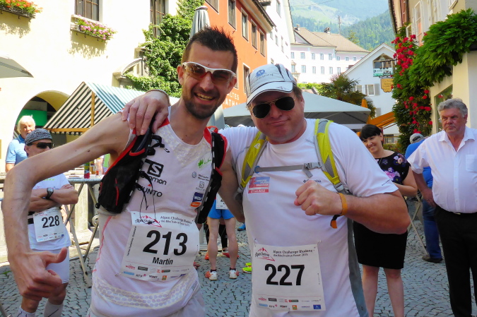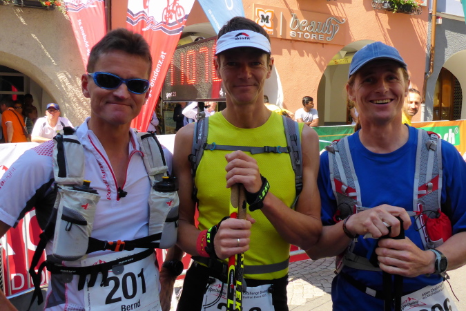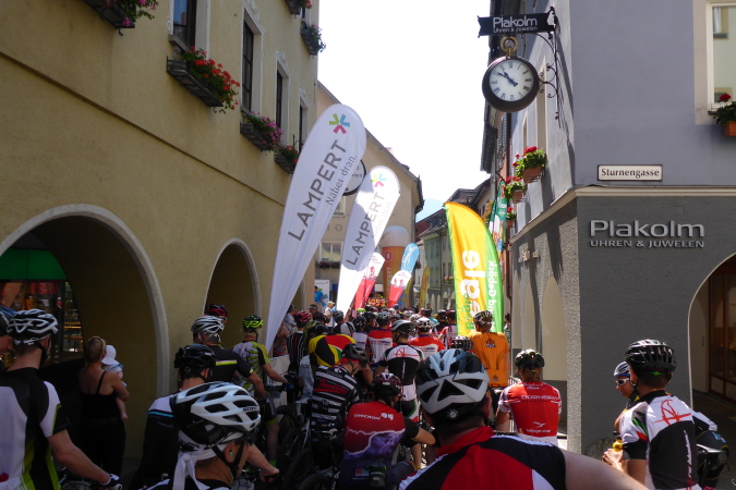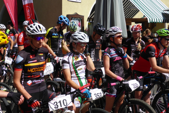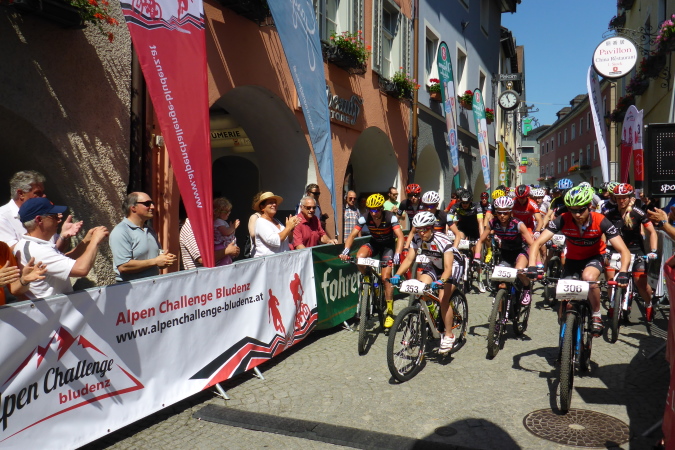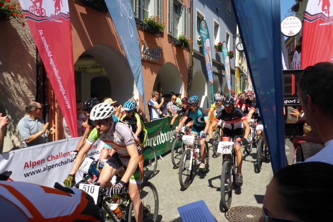 Der Alpen Challenge ist zunächst einmal ein MTB- Event: 158 km, 6750 Hm.  Richtige MTBler sind noch viel bekloppter als Läufer. Daniel Federspiel ist Gesamt-Weltcupsieger, Olympiateilnehmer, Europameister und noch was. Christoph Soukup war auch zweimal bei Olympia, ist vierfacher „Staatsmeister“. Die kassieren Preisgeld für die täglich stattfindenen Wettkämpfe, aber nicht für die viertägige Tourwertung, denn Andreas Traxl und Tobias Jenny machen die gesamte Challenge. Beide starten für den Club „Mooser Wirt St. Anton“, dort wo ab 17 Uhr bezahlte Männer nackt auf dem Tisch tanzen. Wo Männer nackt tanzen, da kommen die Frauen. Das hat was und R. deswegen Hodenprellung.
