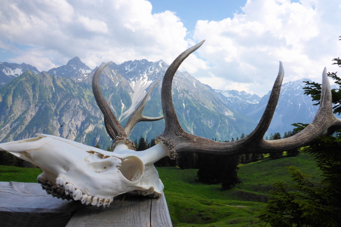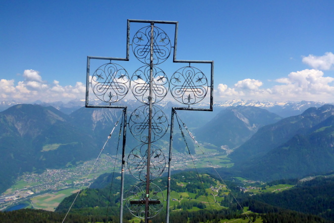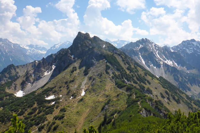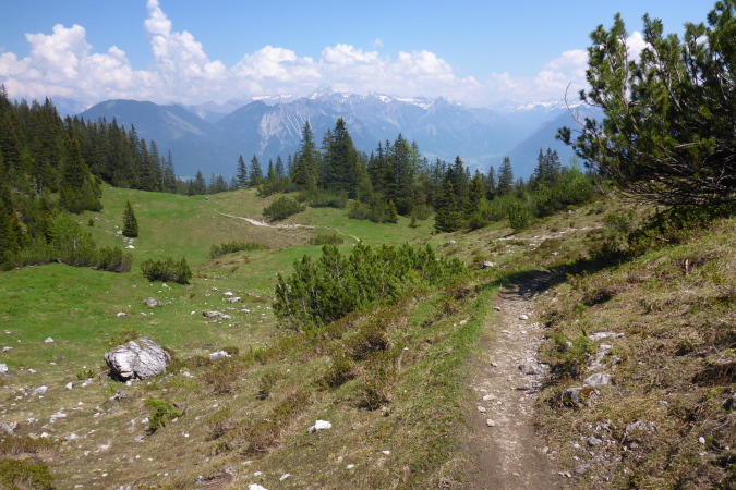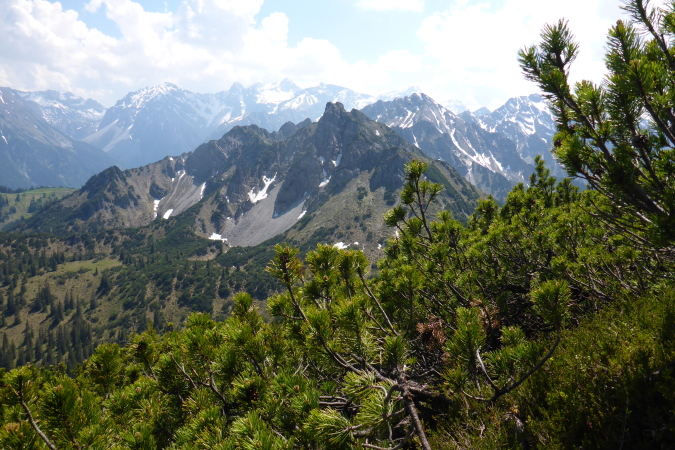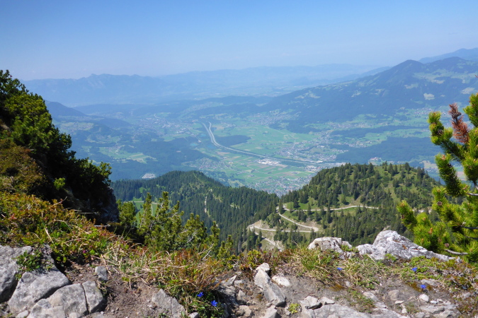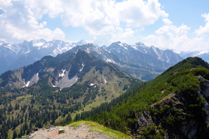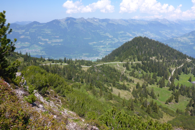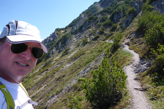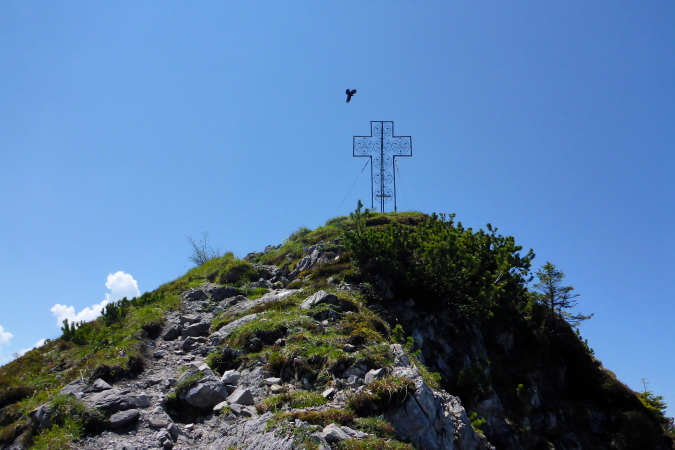 Oben am Gipfelkreuz (1967 m) ein kurzes Friedensangebot an Ralph, ein Blick zum Bodensee, nach Liechtenstein, wo nächste Woche ein einfacher Marathon stattfindet, Blick zum G7er Gipfel, der mal ein G8er war, Selbstauslöser und dann löse ich mich auch aus und steige hinab.