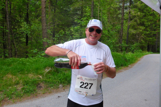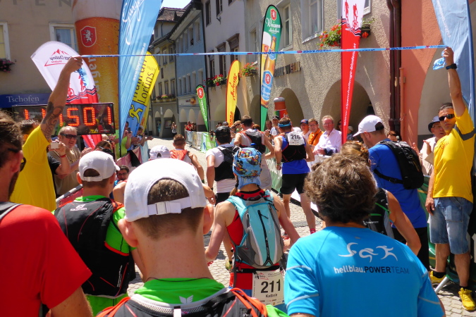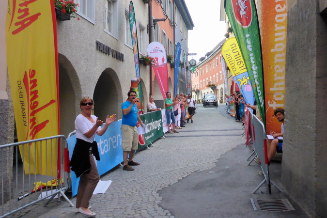 Bürs ist ein Dorf, dessen Kindergarten 26 Kinder betreut. Ich lege eine Gedenkminute ein, sowas gibt es ja nicht überall! Einmal im Jahr fährt ein Zug in das Umspannwerk, wohl mit einem aufbereiteten Castorcontainer, weswegen wir mehrfach ins heisse Tal hinundher laufen. Die Jugend ist begeistert von mir: „Die sind ja vorhin hier durchgefegt, die hatten kein Auge für uns!“ Ich sage ihnen, das sind die Läufer vom Team Seppelmaier und Brandweinfranzl, und frage nach einem Bier und schnorre eine  Bratwurst. Dann holt mich ein Helfer mit dem Fahrrad ab: „Ich begleite dich jetzt ins Ziel, die warten alle auf dich!“