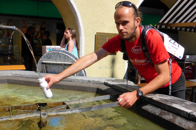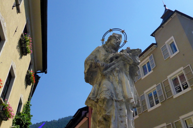 Täglicher Start/Zieleinlauf am Nepomukbrunnen (1730) im Zentrum von Bludenz. Tägliche Startzeit 11:15 Uhr, also nicht nur auslaufen, sondern auch noch ausschlafen. Donnerstag ist Feiertag, der Freitag ist Brückentag, der Nepomuk der Schutzheilige der Brücken, die über die kühlen Gebirgsbäche in den grünen Tälern führen. Oder?