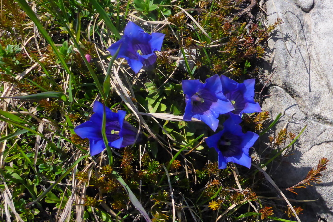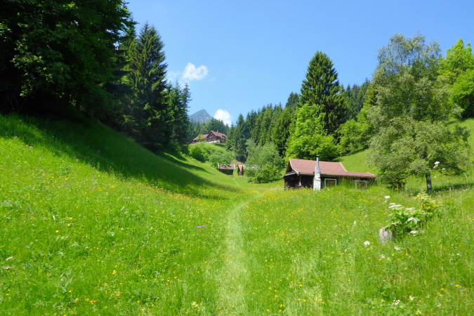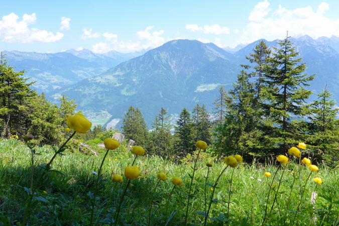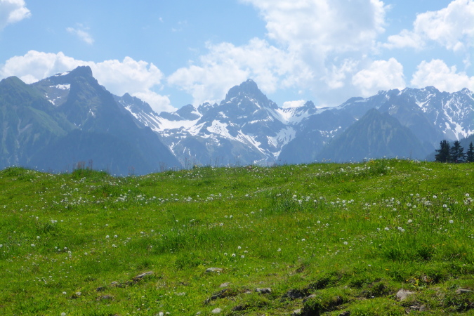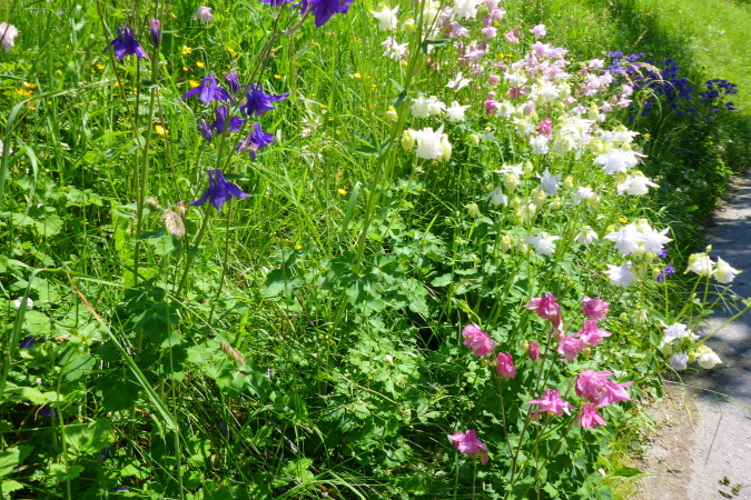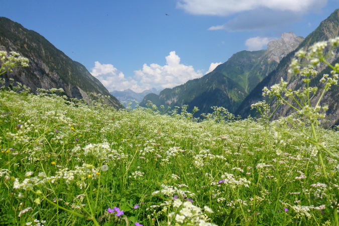 Vom Brandnertal ist nichts zu sehen, absolut nichts, es geht nur den Berg hinauf. Nicht schlimm, denn die Sonne scheint, die Vögel zwitschern und die Blumenwelt ist eine Sensation. Bestimmt kommt bald eine Almhütte, wo ich ein Bierchen bekomme. Im Briefing wurden wir ermahnt, bei jeder Brunnengelegenheit die Wasservorräte aufzufüllen, das mache ich brav, bin ja erfahren.