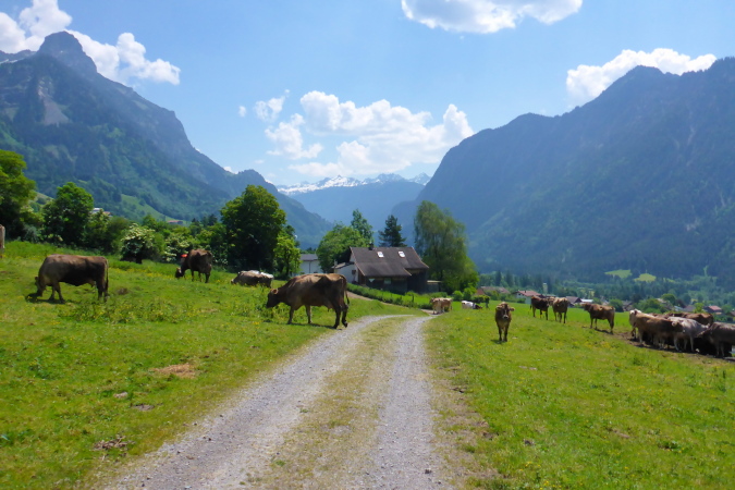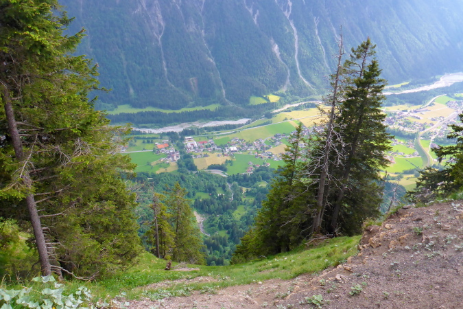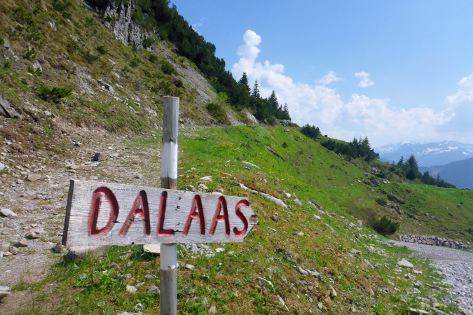 Ich entscheide mich für den weiteren Aufstieg zur Freiburger Hütte, der technisch so schwierig ist, wie ich es noch nicht erlebt habe. Unten im Tal die Ortschaft Daalas (walisisch für Tal-aus). Es geht ohne Serpentinen 3 Stunden steil hinauf zum Rauesjoch, bis ich wunderbarerweise von allen Seiten von der unüberwindbaren Fensterlewand (2300 m) eingeschlossen bin.