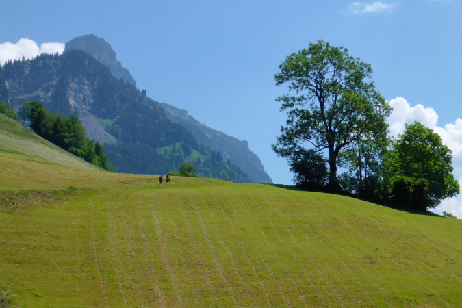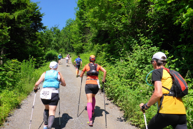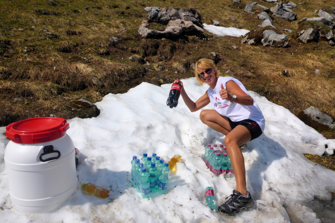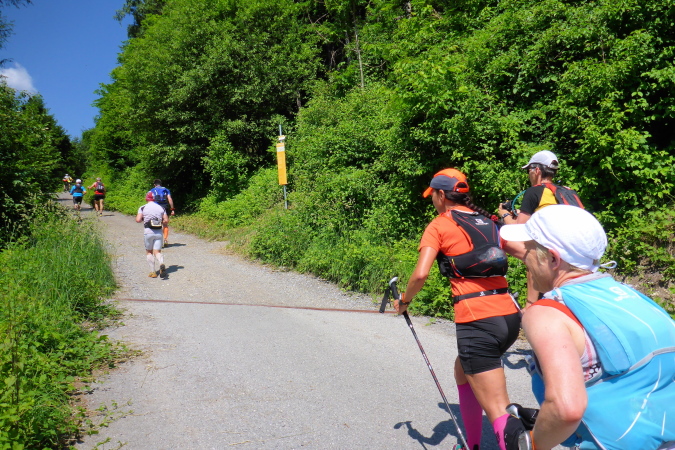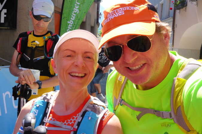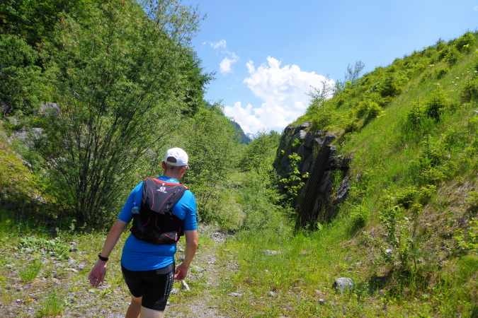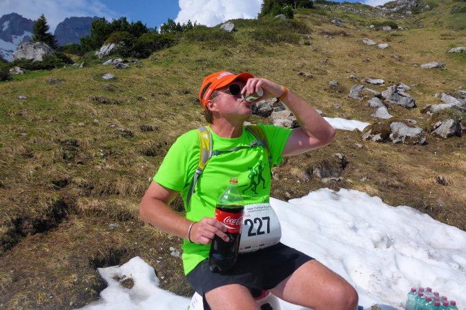 Bei km 10 kommt der erste VP, ich bin ziemlich aufgelöst. Wir bewegen uns nun seit 2 Stunden auf einer Höhe von 1000 Metern, die Steigung, die Hitze von 35 Grad in den Bergwiesen, die starke Sonneneinstrahlung, ich bin fertig. Fünf Kilometer und eine Ewigkeit weiter erklären mir zwei Jungs bei einer dicken Portion Wasser, dass ich besser aussteigen solle, es geht jetzt nämlich 850 Meter hinauf. Dann kommen die Eisfelder und der Grat, wo es links und rechts und so weiter …, eine Umkehrmöglichkeit und was weiss ich was, es sei saugefährlich, ich solle unbedingt mit ihnen zurück ins Tal.