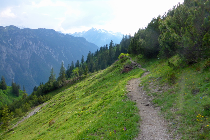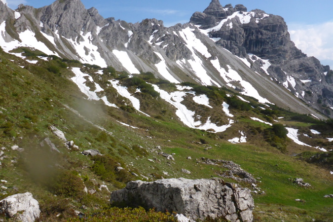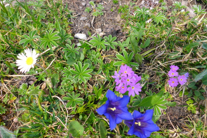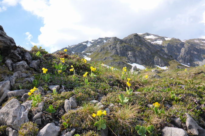 Der Lech, und das ist jetzt interessant, fliesst nicht Richtung Bludenz, zum Rhein, was ja naheliegend wäre, sondern über Lech/Zürs zur Donau. Bei Füssen passiert er dann die Grenze nach Deutschland. Ich passiere jetzt den Sattel in der Fensterlewand. Das dauert nochmal eine Stunde, dann noch ein paar Blümchen und ich bin nach insgesamt 5 Stunden an der Freiburger Hütte (1900 m), dem zweiten VP bei km 20. Ich habe die Hälfte geschafft!