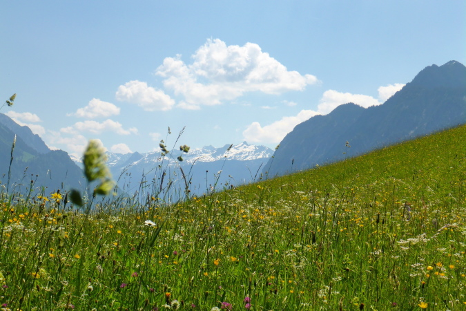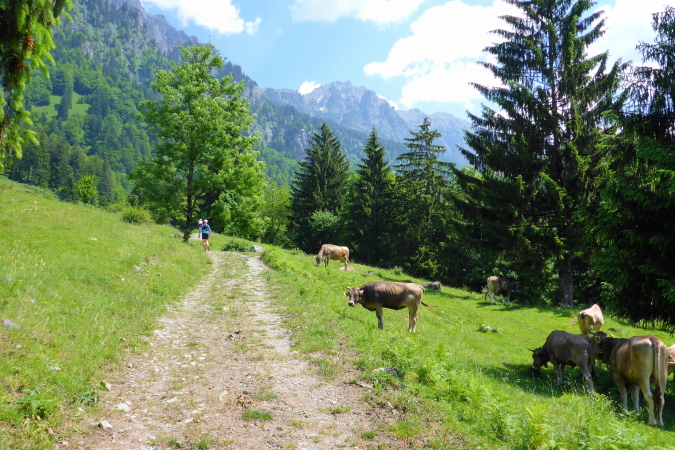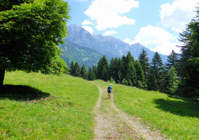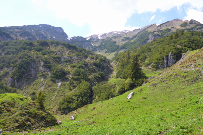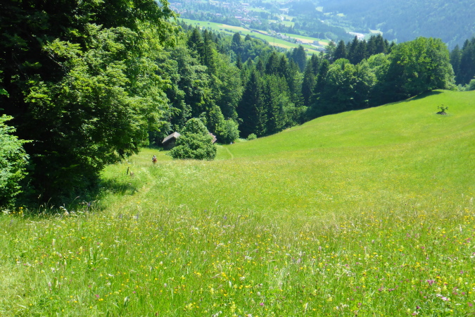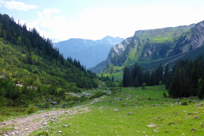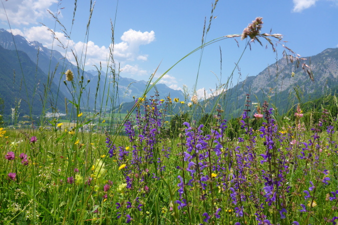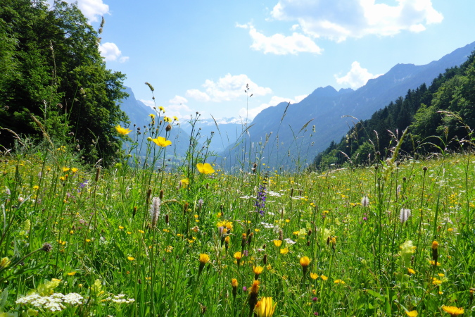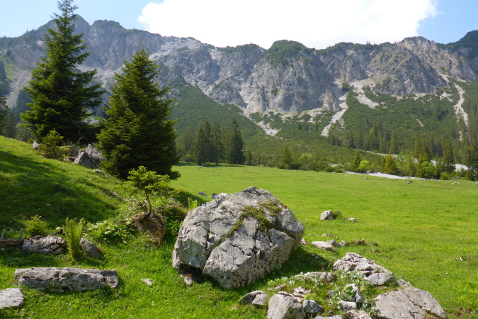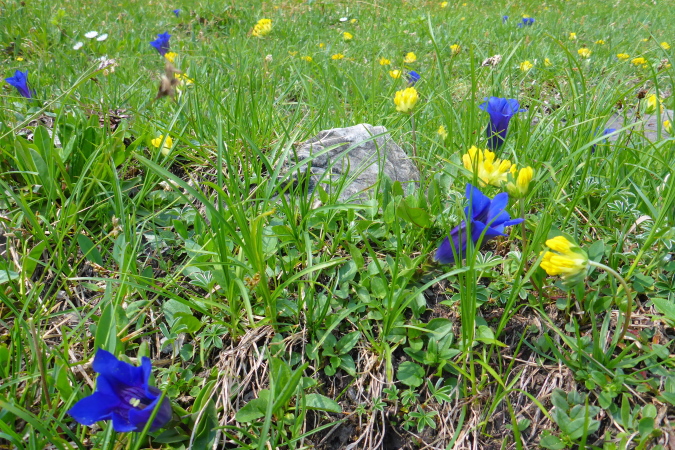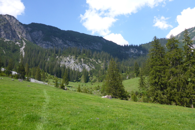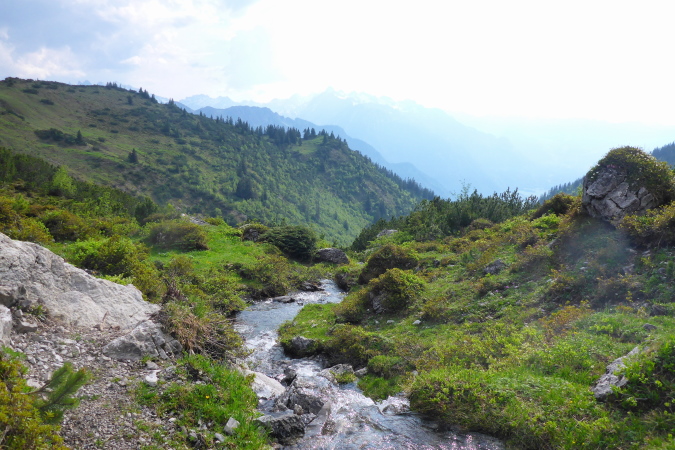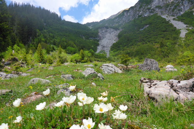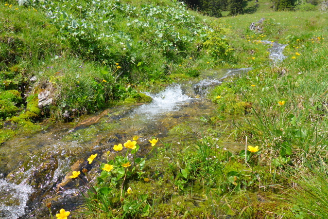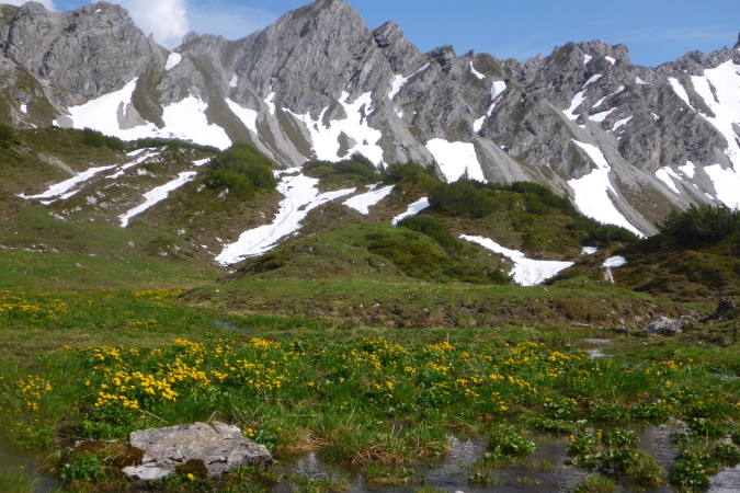 Es ist ein wunderschönes Trogtal mit vielen kleinen Quellen, an denen die saftigen, fetten Trollblumen blühen und von den Hängen die Murmeltiere bei meinem Anblick aufgeregt fiepen. Ich, der ich alles, nur kein Wasser mag, schütte mir das eisige Nass aus einer Quelle über den Kopf und in den Rachen. Es sind die Bödener Magerwiesen. Hier am oberen Ende entspringt der Lech in einer Quellbreite von einem Meter. So kräftig, dass ich mir lieber die Schuhe an den kleineren, seitlichen Quellen nassmache. Da sind die Schlüsselblumen, der tiefblaue Enzian, die weissen Maßliebchen, der Thymian, den ich mir unter die Nase reibe, und der kleine lila Gamander. Ich liege mittendrin in einer eisigen, kleinen Quelle, rolle mich wie ein Welpe auf dem Rücken hin und her. Das Wasser ist richtig kalt, aber ich bin frei, endlich frei! Keine Drohne hat mich verfolgt, niemand muss wissen, dass ich gerade glücklich bin.