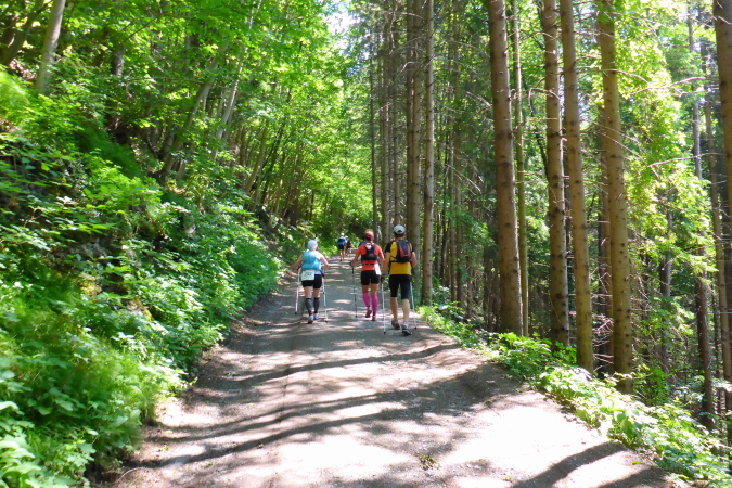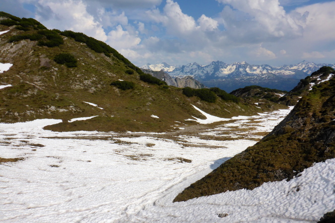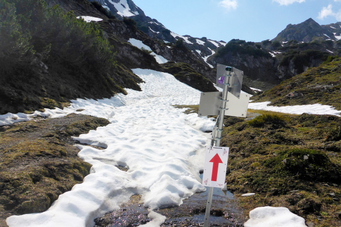 Dann hänge ich mich an Christa. Was heiss ist, ist der Weg, gegenüber sieht man den Skilift zum Silbertal, dessen Erzvorkommen die Gegend reich gemacht hat. Genau in einem Monat, am 04.07. findet hier der Montafon Arlberg Marathon statt, der diesem Event hier nicht das Wasser reichen kann. Weiter westlich die Sonnenkopfbahn, dort ist das Wasser noch durchgehend gefroren.