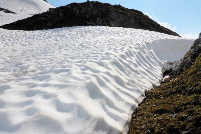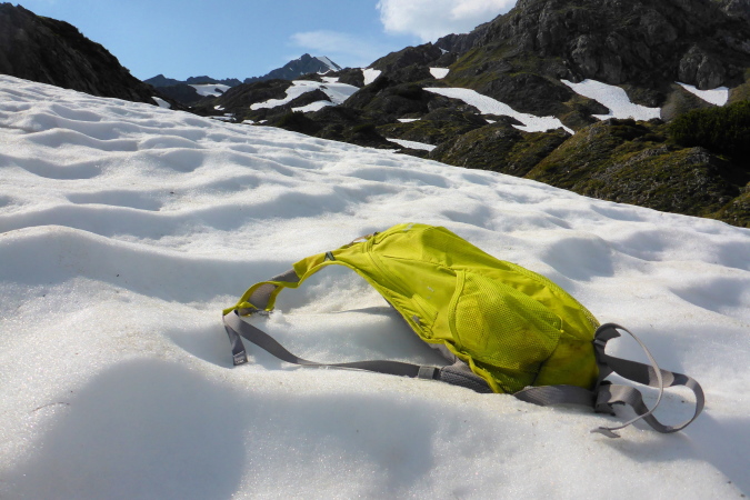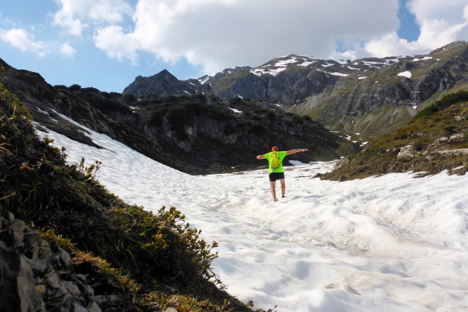 Gott, was habe ich für einen Spass hier im Schnee, und das im Juni! Ist ja kein Arsch mehr hier oben, mache Selfies mit Selbstauslöser. Bin sowas von bekloppt, lege mich in den Schnee und kratze mir den Rücken, uuuh das ist kalt und nass. Dann positioniere ich die Kamera, zähle die Sekunden des Selbstauslösers und laufe zurück, mache Faxen, hüpfe rum und fluche, wenn´s nix war, weil ich dann die Show wiederholen muss. Ich habe einen an der Eiswaffel! Dann reisst es mich von den Füssen, genau am Gwurfjoch. Musste ja sein, sonst wäre nicht der Name…ich finde den Weg nicht mehr!