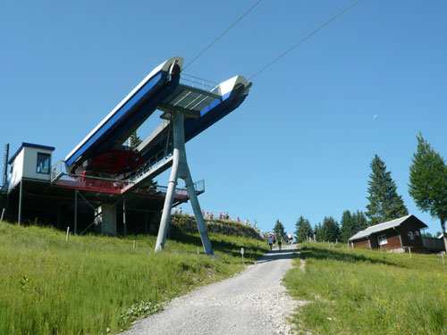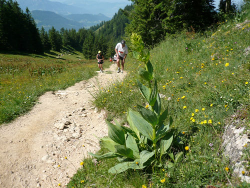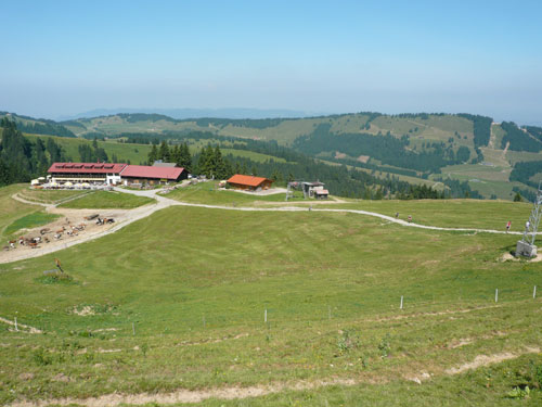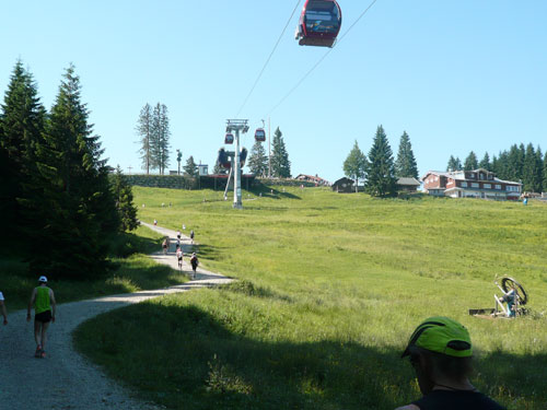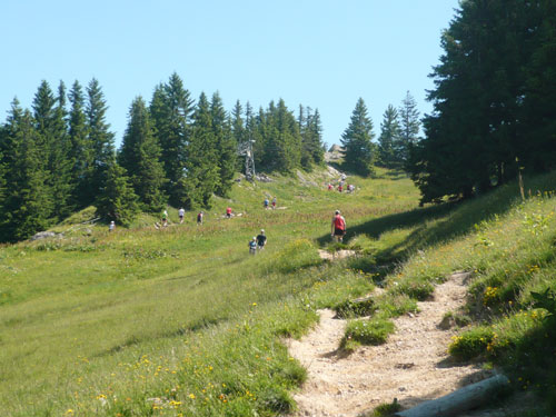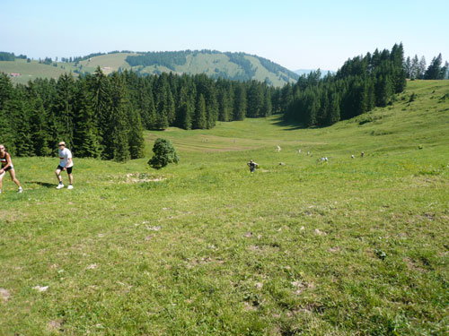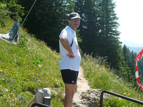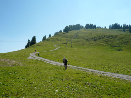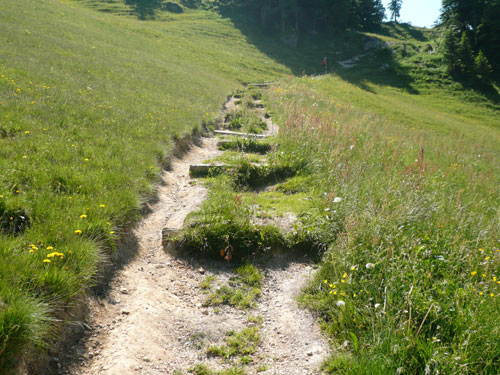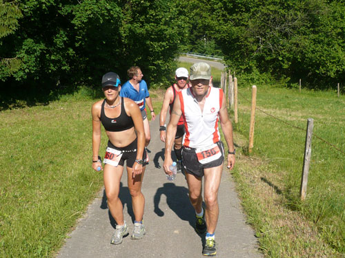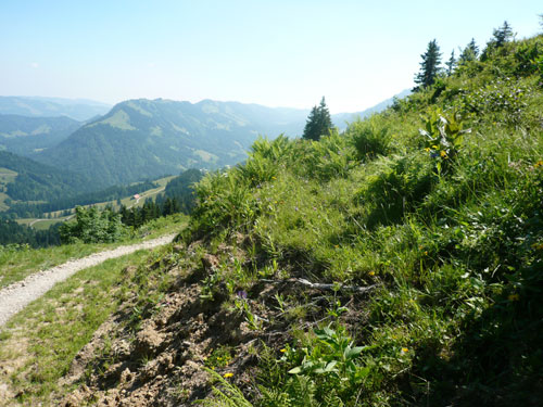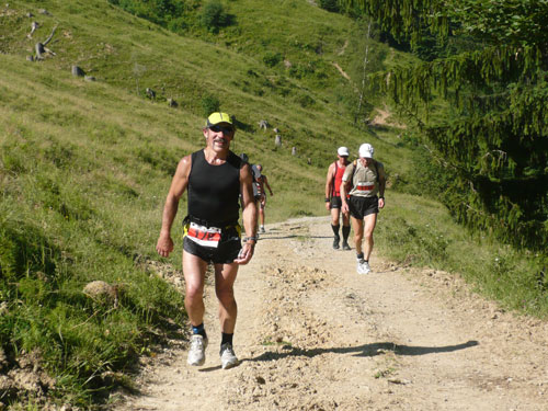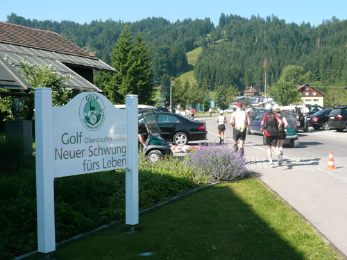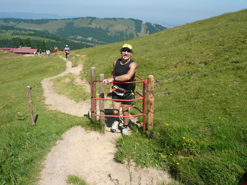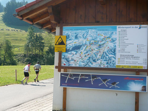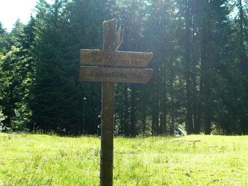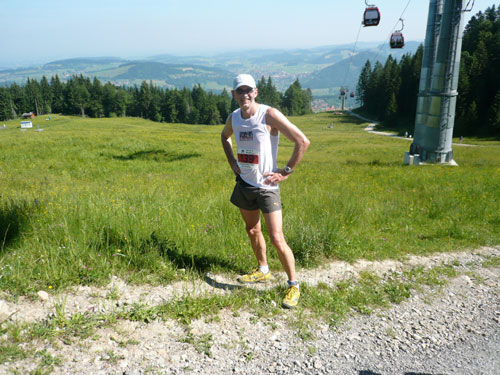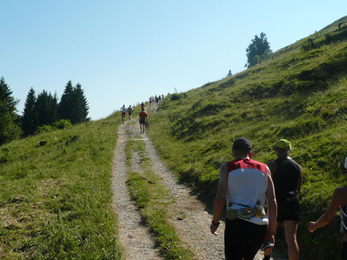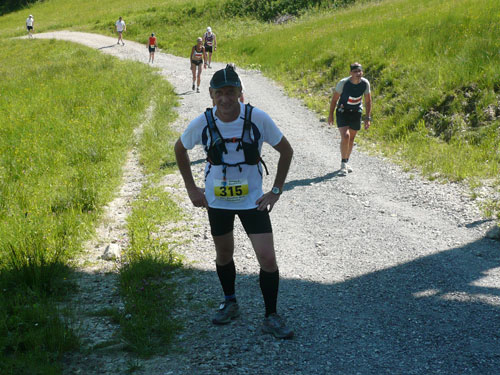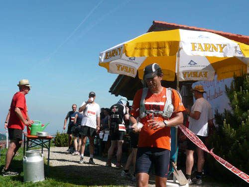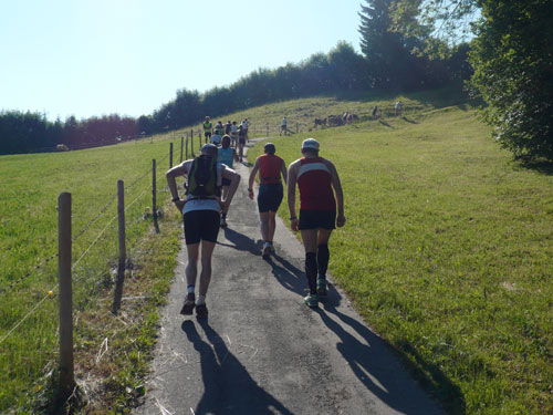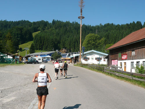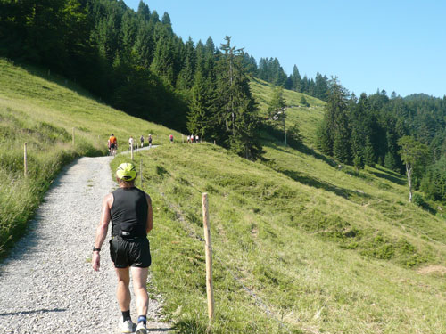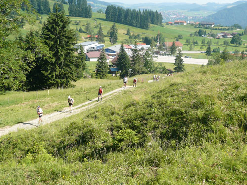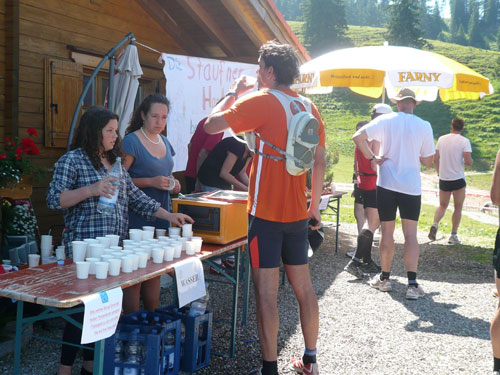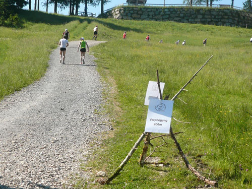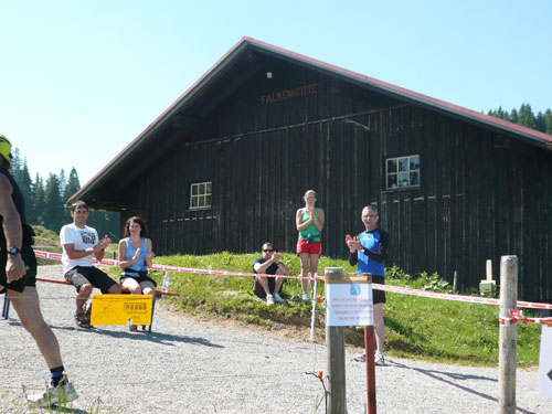 Hier verabschieden sich die 2/3 Läufer von uns, mir ist es aber nicht bewusst, weil ich mich über deren Streckenführung nicht informiert habe. Die Hinweisschilder sind mir auch nicht aufgefallen. Aus versehen laufe ich auf die kürzere Strecke, aber ein Ordner passt gut auf und schickt mich zurück in die entgegen gesetzte Richtung. Nach einem kurzen Waldstückchen führen die nächsten 2 km auf Teer-und Wanderwegen überwiegend locker bergab. An einer zusätzlich eingerichteten Wasserstation kommt uns dann aber ein 2/3-Läufer schimpfend entgegen. Er hat oben am Imberghaus die falsche Richtung eingeschlagen und niemand hat es bemerkt, erst jetzt vor dem Anstieg zur Falkenhütte kam ihm der erneute Anstieg spanisch vor. Er muss jetzt wieder die zwei km bergauf zur Sesselbahn zurück. Da sollte von Veranstalterseite an der Ausschilderung noch gefeilt werden.