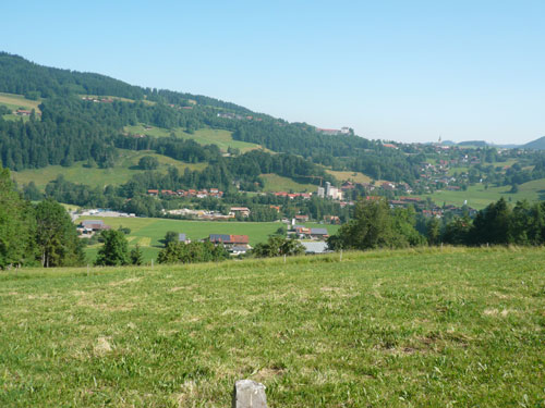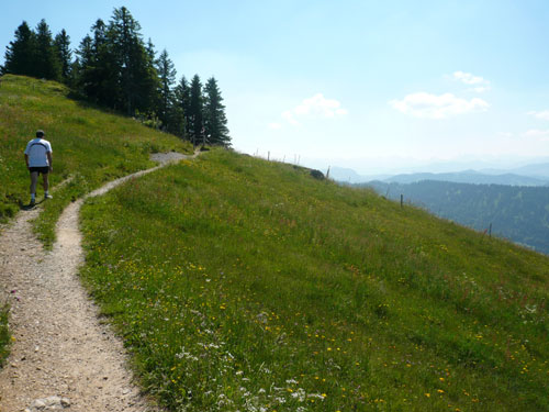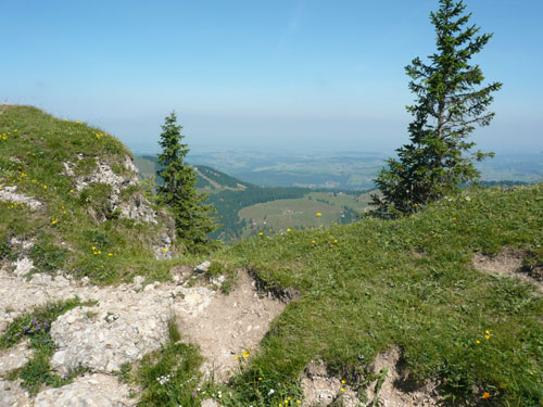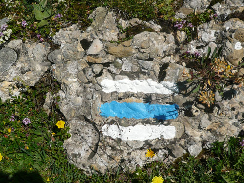 Saxni di, was ist denn das? Mitten auf einem Brocken des Gesteins ist eine Flagge aufgemalt. Weiss-Hellblau-Weiss, das sieht ja fast aus wie die Argentinische Flagge, da wird doch nicht irgendein Gautscho unterwegs gewesen sein und die Vorfreude für heut Nachmittag auf das Gestein gepinselt haben. Nachdem sich dies aber doch mehrmals an besonders exponierten Stellen wiederholt, denk ich mir, dass es wohl doch eher die bayerischen Farben sind und vielleicht so was Ähnliches wie eine Grenzmarkierung darstellen. Rechts geht es nach Österreich runter und links sind wir zuhause.