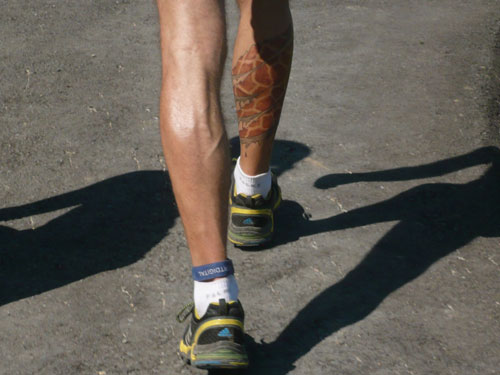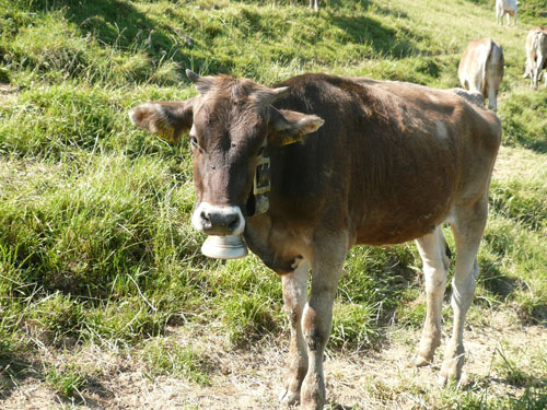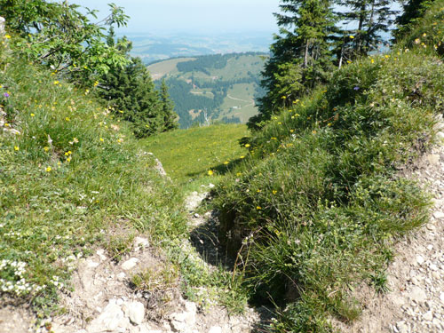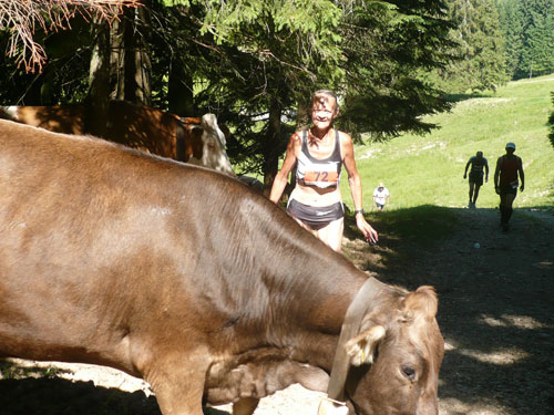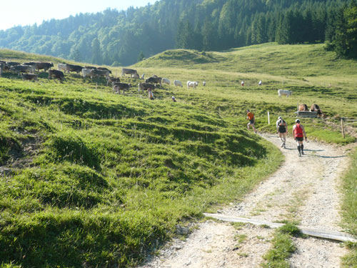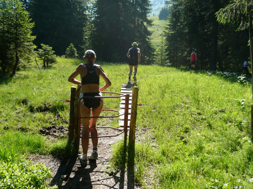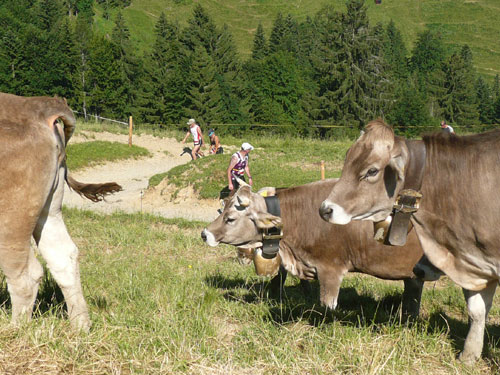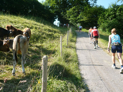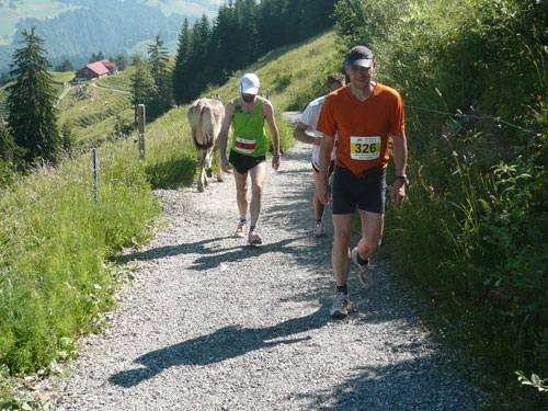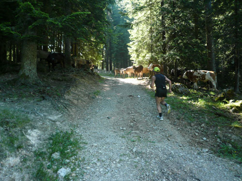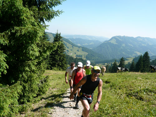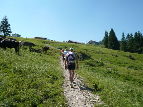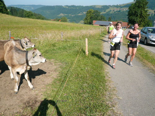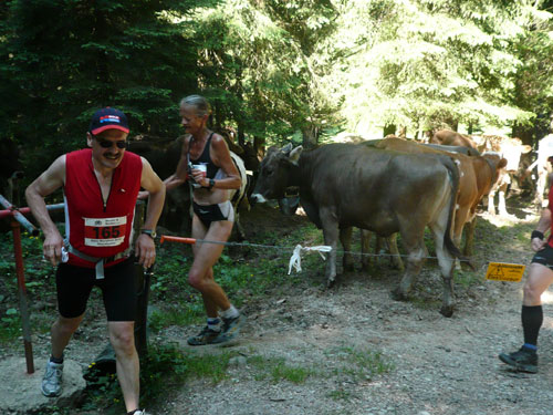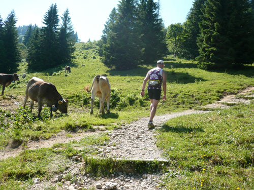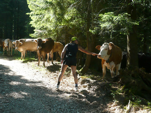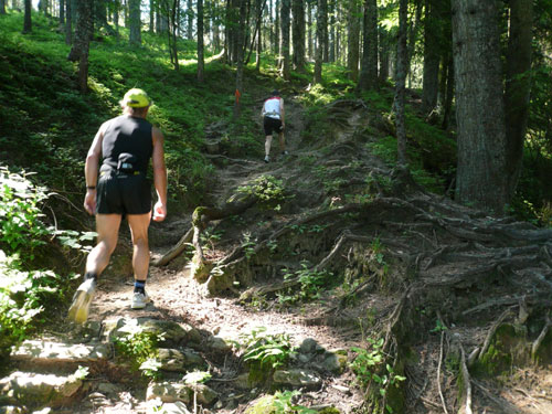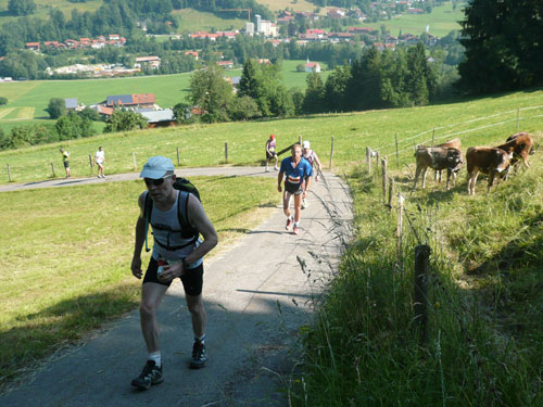 Eine ganze Herde glücklicher Allgäuer Kühe stellt sich uns ein paar Meter weiter in den Weg, sie sind aber alle überaus friedlich und bereiten keinerlei Probleme und lassen uns bereitwillig per Gatter in ihr Revier. Ab hier werden die Wege und Trails immer rustikaler und beschwerlicher, sprich steiler. Über Wurzeln und Waldwege, Naturtreppen und Wiesen führt der Weg aufwärts zur Falkenhütte. Ein großes Lob möchte ich an dieser Stelle dem Veranstalter aussprechen, er hat auf die Hitzewelle prompt reagiert und selbst hier, mittendrin im gefühlsmäßig fast senkrecht nach oben führenden Steilstück ist eine weitere Wasserstation installiert. Ich habe sie nicht gezählt, aber ich glaube dass mindestens fünf zusätzliche, zu den 9 fest geplanten V-Stellen auf der kompletten Strecke aufgebaut wurden.