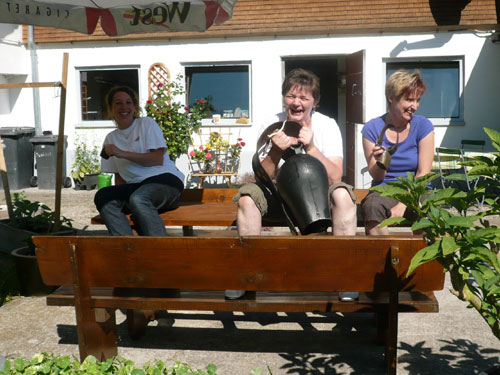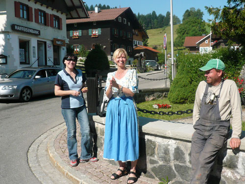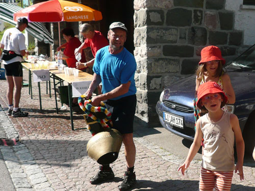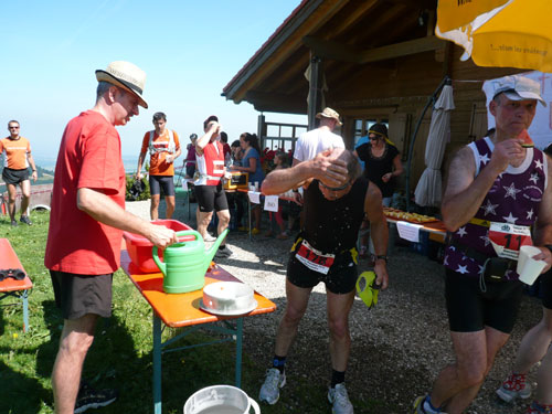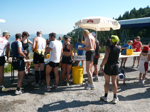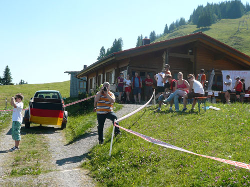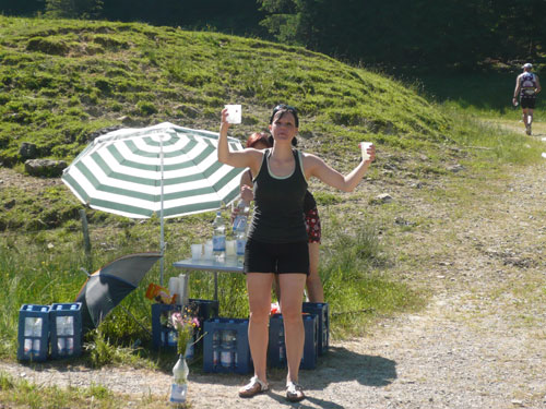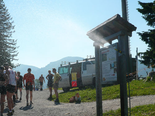 An der Falkenhütte wartet schon der Mann mit der Gießkanne auf uns, die Abkühlung kommt zur rechten Zeit. Wir befinden uns jetzt auf einer Höhe von 1.400 ü. NN, was sich doch spürbar auf das Klima auswirkt. Ich habe das Gefühl das es mit dem dazu herrschenden schwachen Lüftchen bestimmt 5 Grad kühler ist und empfinde es jetzt ganz angenehm. Natürlich gibt es zum kalten Wasser über den Kopf auch selbiges zum Nachtanken und zusätzlich auch Cola, Iso, Bananen und Kekse. Außerdem haben sich auch einige Fangruppen eingefunden – Die Deutschlandfahne für das WM-Viertelfinale gegen Argentinien heute Nachmittag haben sie auch schon gehisst.