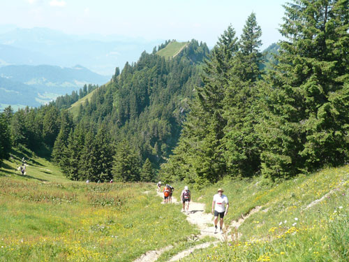 Zwei Kilometer und 150 hm weiter erreichen wir den Einstieg und zugleich das schönste Stück der Strecke, vielleicht sogar einen der beeindruckendsten Abschnitte der Allgäuer Alpen, die 24 km lange Nagelfluhkette. Natürlich ist dieser hochalpine Abschnitt nicht prädestiniert für schnellste und flüssige Laufbewegungen und daher ist auch große Vorsicht geboten, aber die kleinen Klettereinheiten machen riesig Spaß. Bei der heutigen grandiosen Fernsicht sind natürlich auch viele Wanderer unterwegs und man muss schon des Öfteren Gas rausnehmen, stehen bleiben und sich arrangieren. Die meisten haben aber Verständnis und machen bereitwillig schon vorher Platz. Wer an diesem Lauf teilnimmt sollte sich vorher schon erkundigt haben was ihn erwartet. Wo Alpin drauf steht, ist auch Alpin drin und so sollte es eigentlich nichts zu meckern geben. Für die meisten weniger Zeitambitionierten wie mich, ist das Laufen in diesem Naturpark ein großartiges Erlebnis, auch um mich herum sind alle anderen Teilnehmer mit denen ich ins Gespräch komme ausnahmslos begeistert. Immer wieder bieten sich uns spektakuläre Aussichten auf unserem Gratlauf.