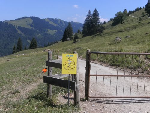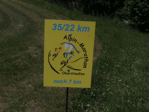 Hinunter geht es im Laufschritt. Der Weg bis zur Verpflegung in Weißach ist bekannt, die Steilstücke fordern jedoch jeden Muskel und viel Motivation. Aber ich bleibe im Laufrythmus. Das 35-km-Schild wird passiert. Zur Aufmunterung steht auch noch drauf: „noch 7 KM“. Ich wäre nicht von selbst drauf gekommen, nehme den Hinweis aber dankbar als Motivationsstütze auf.