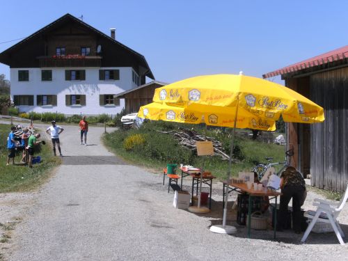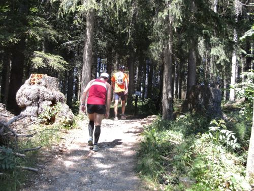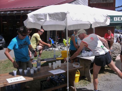 Es folgt ein leichtes Auf- und Ab durch zumeist schattigen Wald und vor Steibis eine weitere Verpflegung. Ich trinke jeweils mehrere Becher Cola, da kommen für einige Meter wieder ungeahnte Kräfte zurück. Leider verflüchtigen sich diese auch wieder rasch. Der Kampf geht weiter. In Steibis erfrischt nochmals eine Dusche an der Straße.