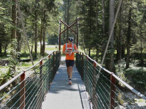 Fotografieren mag ich kaum noch, es ist mir schlichtweg zu anstrengend. Ich bitte um Verständnis. Der Weg entlang der Weißach ist angenehm schattig. Über den Tarzansteg wechseln wir nach einiger Zeit auf die linke Seite der Weißach. Unterwegs ist eine größere unangenehme Steigung zu meistern. Freuen tun sich hierüber wohl nur wenige.