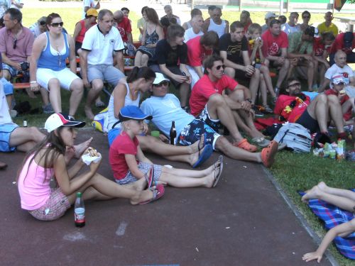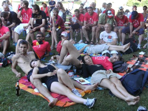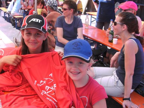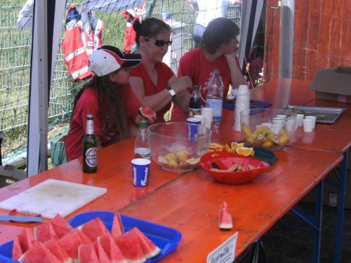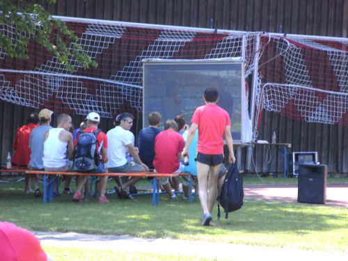 Im Schatten der Sporthalle haben die Veranstalter ein Public Viewing eingerichtet. Schließlich ist Fußball-Weltmeisterschaft und 16 Uhr beginnt das Viertelfinale Deutschland – Argentinien. Die Siegerehrung findet diesmal etwas weniger Zuspruch. Der Läufer und die Läuferin schauen jetzt lieber ins ferne Südafrika. Jens und ich gehen erst mal duschen. Dem 4:0 Sieg von Jogis Kickern über Diegos an diesem Tag überforderte und von Gottes Hand verlassene Gauchos schauen wir danach in der Endphase zu.