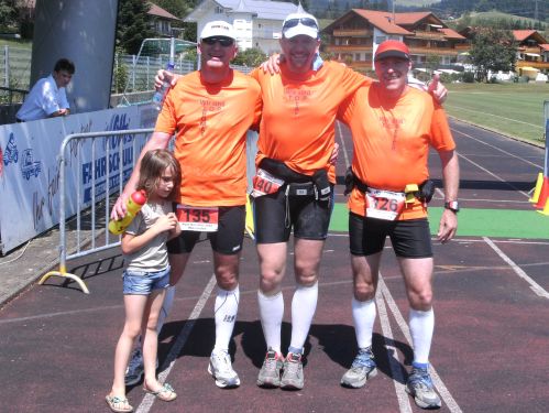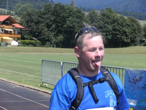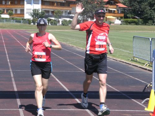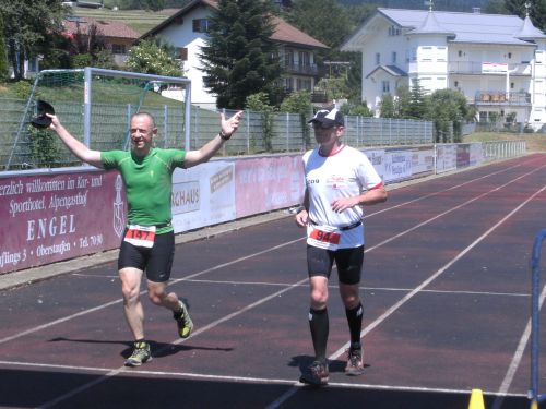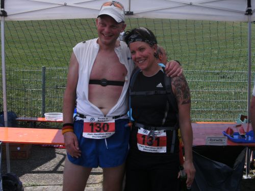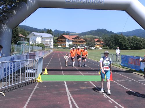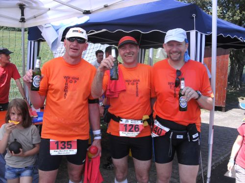 Zusammen mit Barbara, die ihre Altersklasse im Zwei-Drittel-Marathon gewinnt, warte ich auf Jens. Er hat sich in Oberstaufen noch etwas „umgesehen“ und macht einige Meter mehr als nur 42,195 km. Er ist halt ein echter Ultra. Aber auch er findet letztlich das Ziel und einige Getränke später ist auch Jens wieder wohlauf.