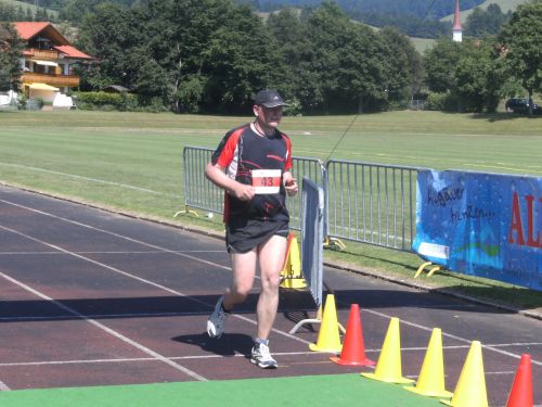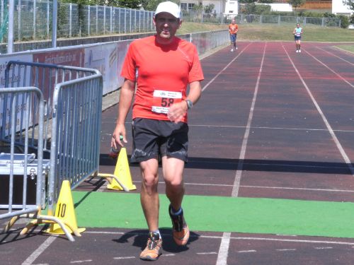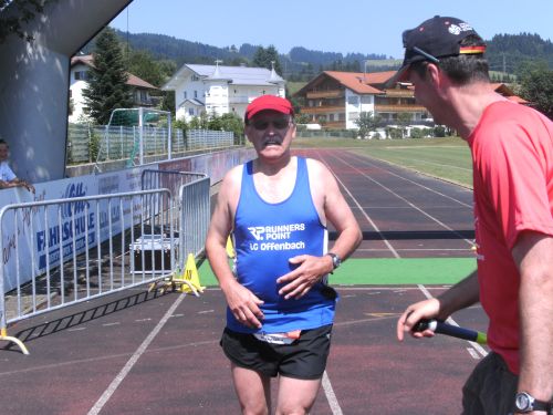 Zugegeben, die letzten Meter parallel zur Bahn und dann vorbei am Sporthotel des ehemaligen Fußballnationalspielers Karl-Heinz Riedle zur Sportanlage Kalzhofen fallen sehr schwer. Vor mir keiner, hinter mir keiner zu sehen. Dafür kommen mir schon Glückliche mit den schönen roten Finishershirts entgegen und muntern mich auf. Ich gehe einige Meter. Ich möchte noch Kraft haben um die letzten dreihundert Meter auf der Tartanbahn der Sportanlage „in Würde“ laufen zu können.