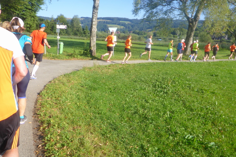 Als wir in Ratholz die Bundesstraße unterqueren, sind wir am Fuß der „Alpsee Bergwelt“. Dort gibt es zum Beispiel mit dem Alpsee Coaster die längste Ganzjahres-Rodelbahn, die einen auf einer über 3000 Meter langen Strecke ins Tal rasen lässt. Auch einen Kletterwald gibt es und mit der Oberen Kalle eine weitere Alpe mit einem schönen Biergarten. Schon mehrfach war ich über ein Wochenende dort oben und freue mich auch schon auf meinen Besuch im nächsten Jahr. Unser Weg führt aber heute nicht über die Obere Kalle, sondern zum Aufstieg nach Gschwend. Die nächsten drei Kilometer führen stetig nach oben. Nur selten sind richtig steile Anstiege zu bewältigen, aber das stetige bergauf zehrt auch ordentlich an meinen Kräften. Trotzdem erfreue ich mich am Blick auf den Großen Alpsee und laufe weiter. Mit einigen Mitläufern komme ich ins Gespräch. Obwohl schon etwas platt, teilen alle meine Begeisterung. So soll es ja sein.
