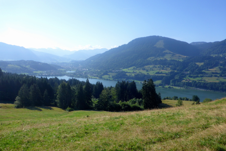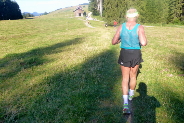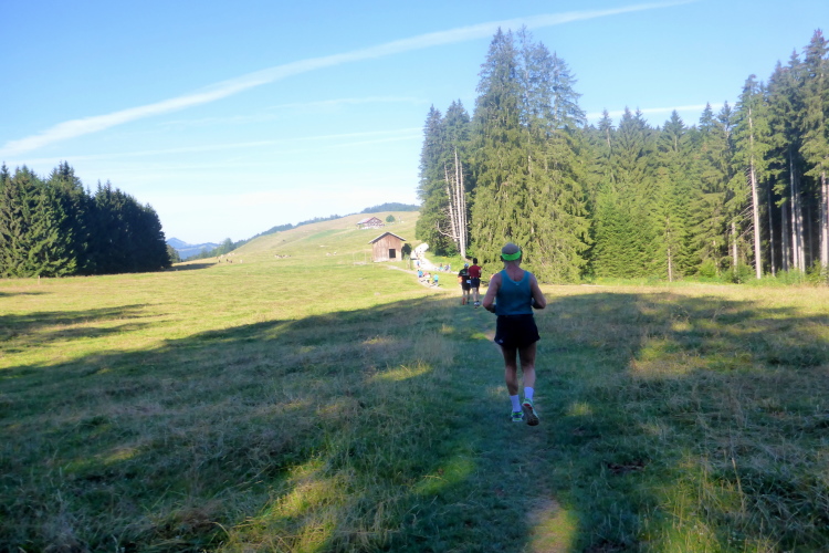 Für den kräfteraubenden Aufstieg werden wir nun belohnt. Auf den nächsten zwei Kilometern geht es über Alpwiesen, Single-Trails und teilweise über Schotterwege stetig bergab. Hier kann man es richtig schön laufen lassen. Nur die vielen Fotomotive verleiten mich immer wieder zu kurzen Stopps. Zu schön sind die Aussichten auf den Alpsee und die dahinterliegenden Allgäuer Berge. Auf einer Wiese geben Kuhfladen den Weg vor und ich laufe ziemlich konzentriert, kann es aber doch nicht vermeiden, in ein wohl noch frisches Exemplar zu treten. Dabei zieht es mir aufgrund des relativ hohen Bergab-Tempos die Füße weg und ich bremse mit dem Ellenbogen in einem weiteren Kuhfladen. Da ich dieses Missgeschick verletzungsfrei überstehe, mache ich mich gleich wieder ungebremst auf den Weg nach unten.