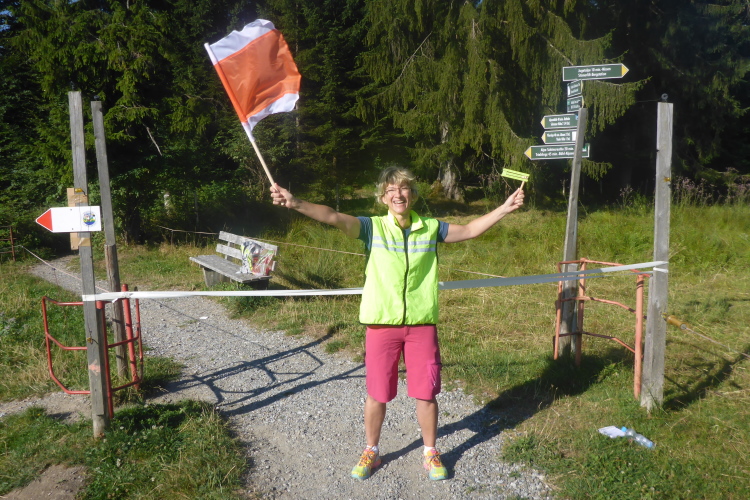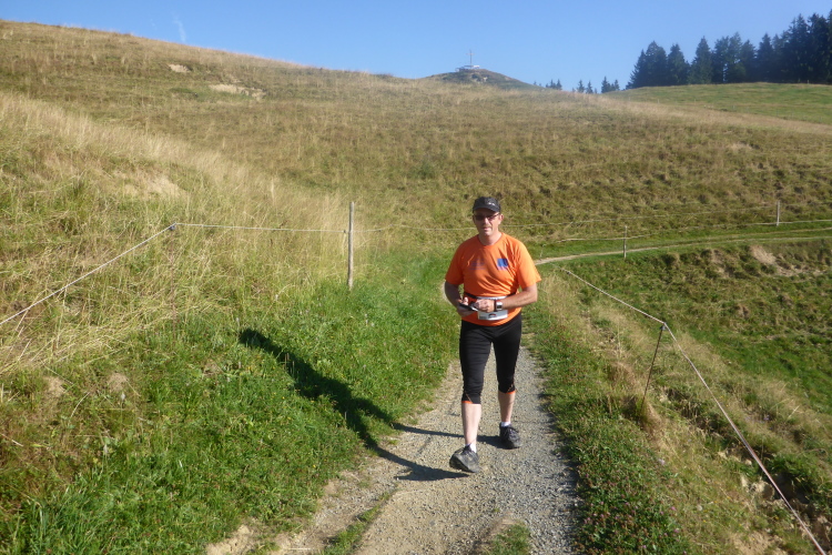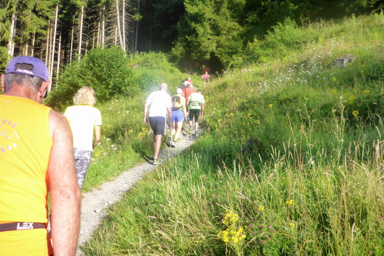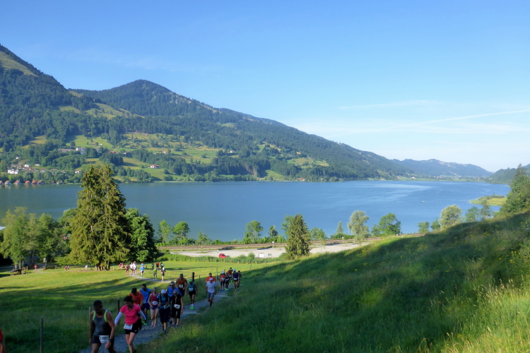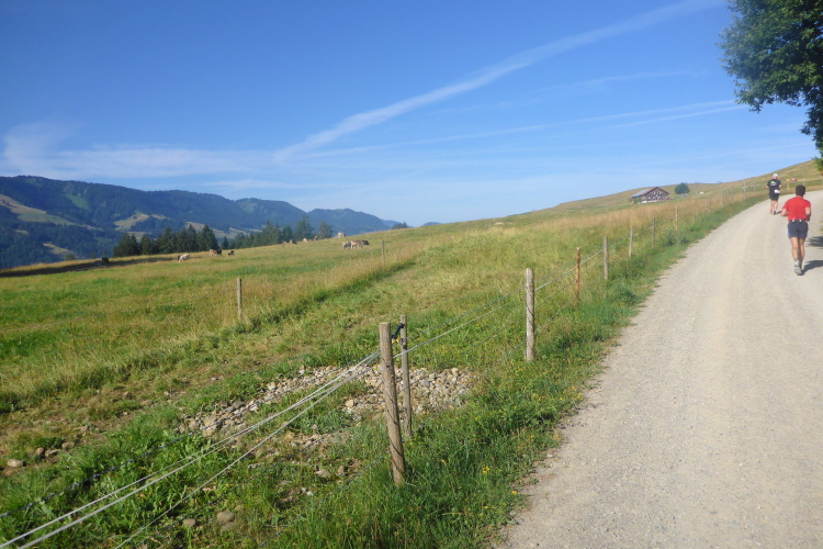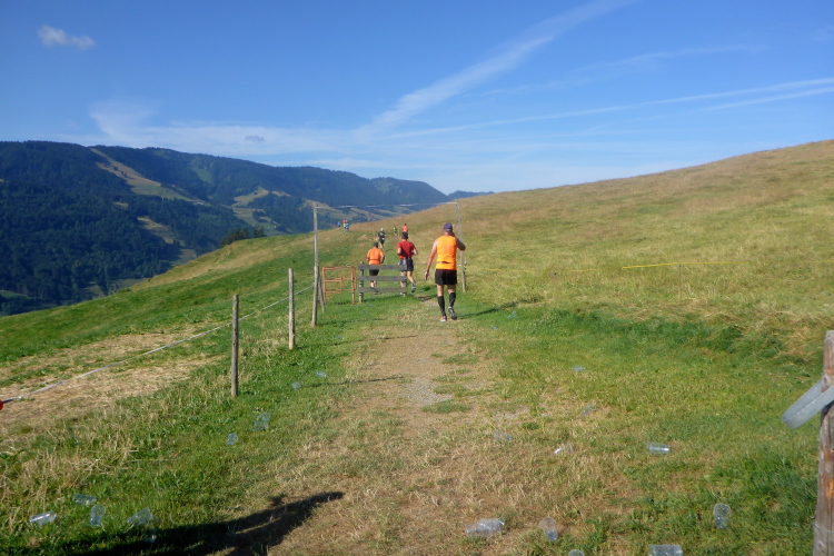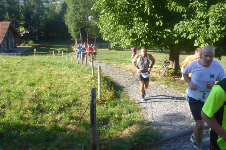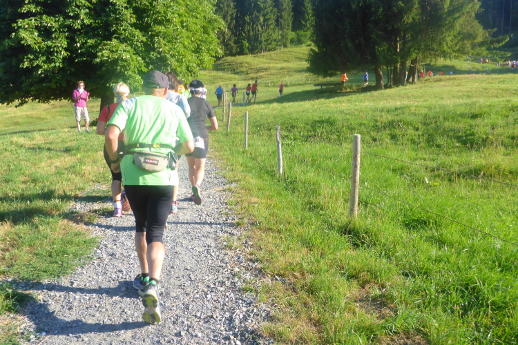Ich habe das Klatschen zwar nicht vernommen, setze mich jedoch mit allen andern in Bewegung und folge dem Feld in Richtung Bühl am See. Bis dahin haben wir etwa drei Kilometer auf Teer und keine nennenswerten Steigungen zu laufen, was ich zum Einrollen ganz angenehm finde. Am Ende der Teerstraße sind wir schon am ersten Verpflegungstand angekommen und ich gönne mir einen kleinen Schluck, da nun der erste Anstieg vor uns liegt.