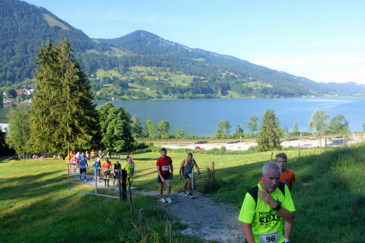 Auch hier wartet ein deftiger Anstieg auf uns, der immer wieder die Sicht auf den Alpsee freigibt. Wurzel- und Treppenpassagen machen richtig Spaß und ich beneide die wenigen 15-Kilometer-Läufer, die sich noch um mich herum befinden, zu keiner Sekunde. Für sie ist der Lauf nämlich in rund vier Kilometern zu Ende.