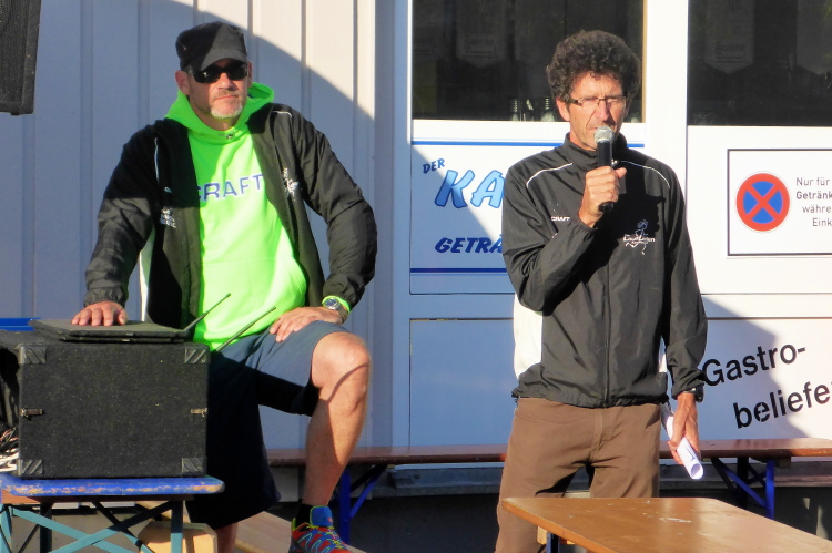 Ich schau mich noch etwas um, kann aber seltsamer Weise kein bekanntes Gesicht erkennen. Lediglich ein Anhänger, sowie der Zielbogen mit der Aufschrift „Allgäu Panorama Marathon“ kommen mir bekannt vor. Dessen Organisator Axel Reusch ist natürlich auch vor Ort und das nicht nur zu Werbezwecken. Mit seiner Erfahrung ist er sicherlich eine willkommene Unterstützung für die Veranstalter. Gerhard Honold von der Triathlon-Abteilung des TSV Immenstadt hat hier die Verantwortung und meldet sich auch kurz vor dem Start zu Wort.