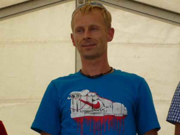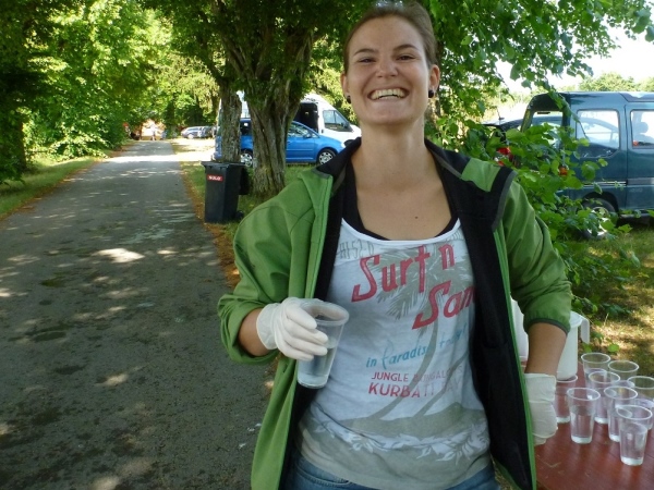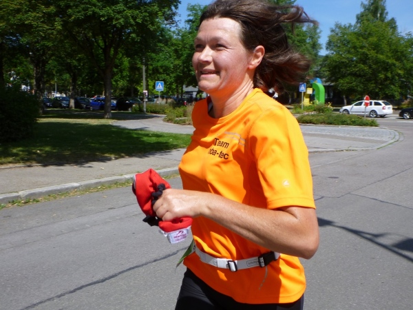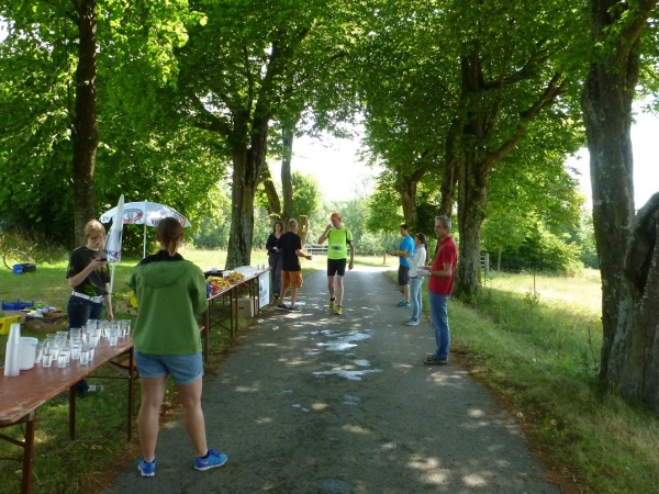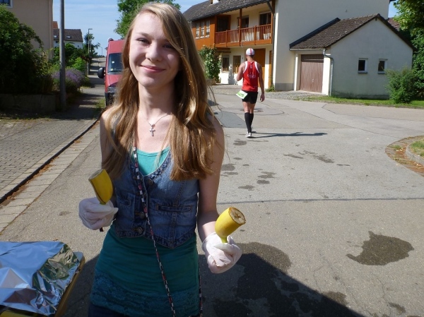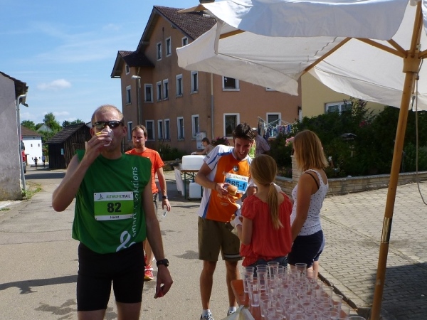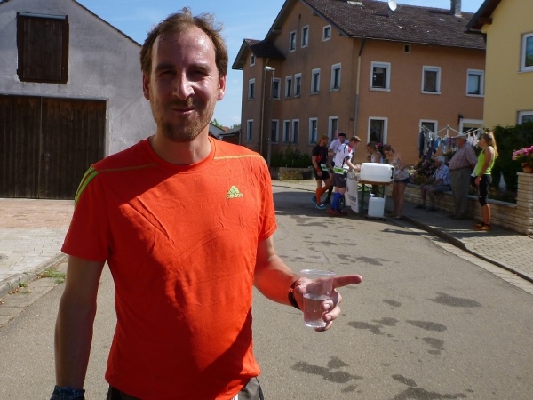 Ich habe noch nicht richtig ausgeschnauft, dann werde ich gleich zum Interview gebeten. Wie meine Eindrücke sind, was man verbessern kann und natürlich auch ein paar Fragen zum Job als laufender Reporter. Gleich neben dem Ziel erhalten wir Trinkwasser und Obst. Bei einem isotonischen Getränk auf Hopfenbasis hatte ich bereits gescheit zugegriffen. So genügen mir jetzt zwei Becher Wasser.