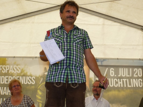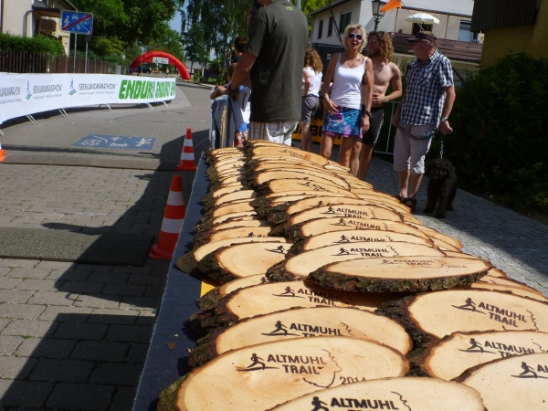 Als Auszeichnung erhält jeder Teilnehmer ein Brotzeitbrettl, das aber eher in den Schrank zu den Medaillen wandert als in die Küche zu den anderen Fleischbrettln. Nach einer kurzen Pause gehe ich wieder meiner Aufgabe nach. Lachen, Jubel und auch Juchzer sind von den Finishern zu hören. Das hat doch allen Spaß gemacht, auch wenn es jetzt von 30 Grad Hitze nicht mehr weit weg ist.