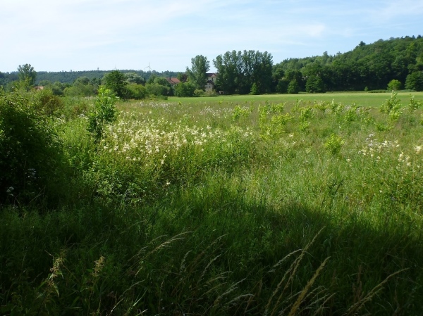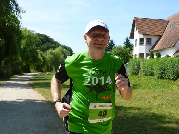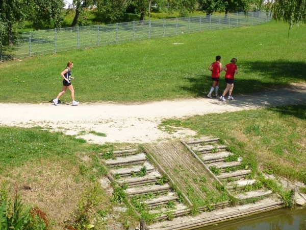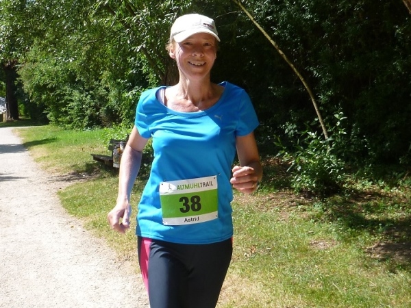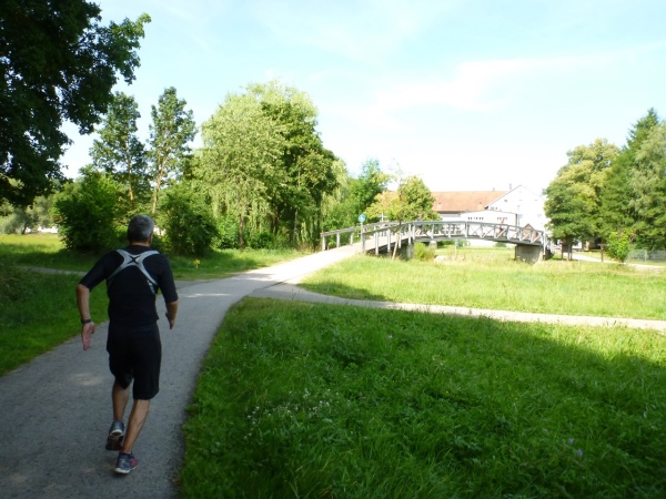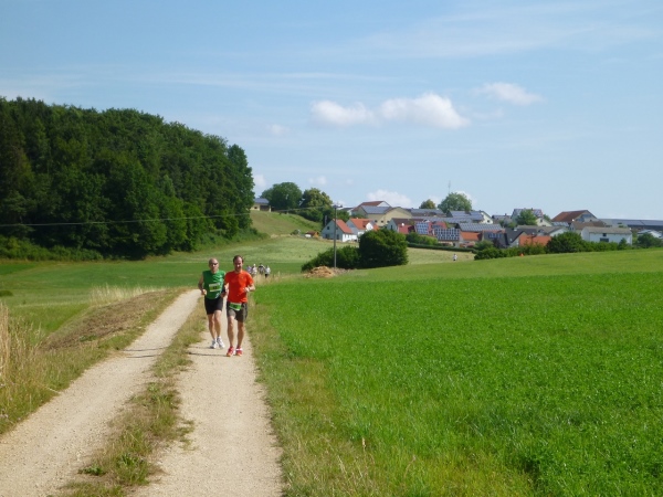 Hier treffen wir kurzzeitig auf die Altmühl und unterqueren die Bundesstraße 2. Ein wenig langatmig sind die knapp zwei Kilometer durch die Auen des Schambach und der Altmühl. Mittlerweile ist es in der Sonne schon recht heiß geworden. Eine Radfahrergruppe kommt recht lautstark entgegen und spricht jeden Läufer an.