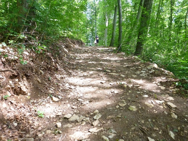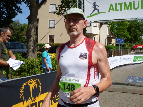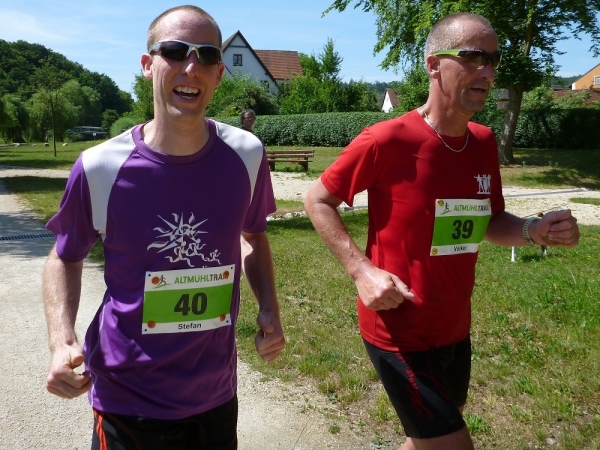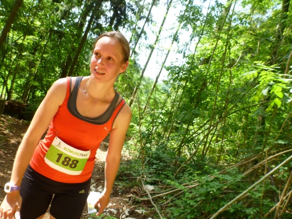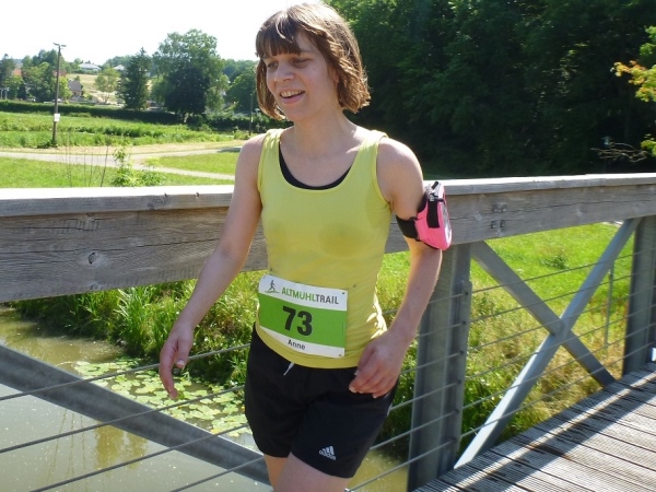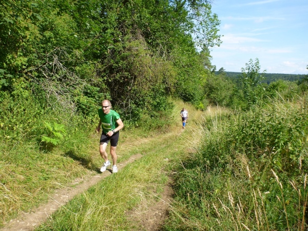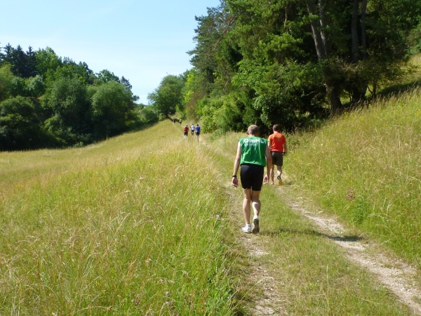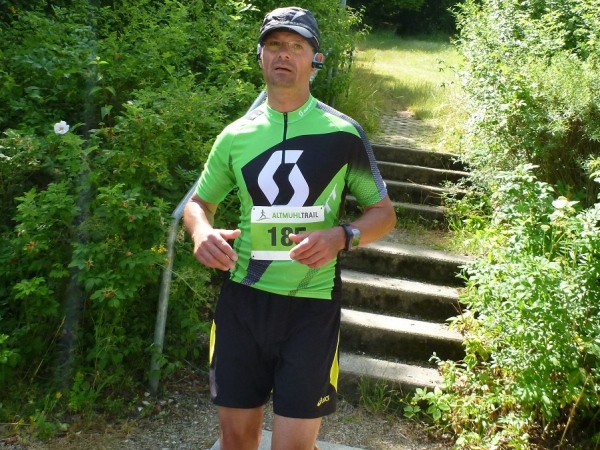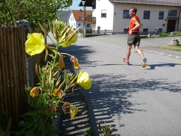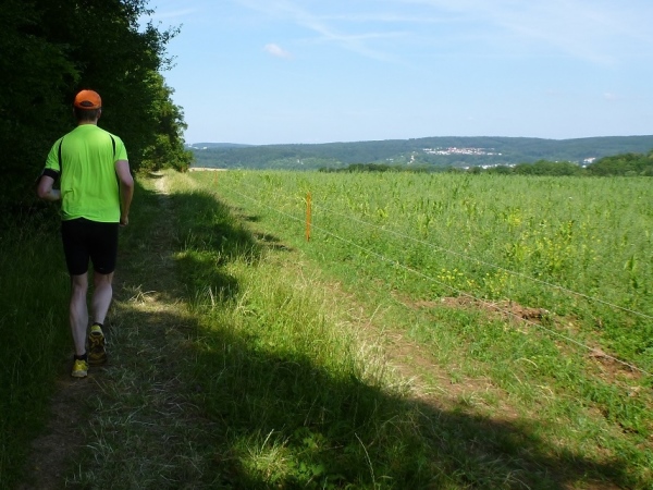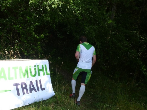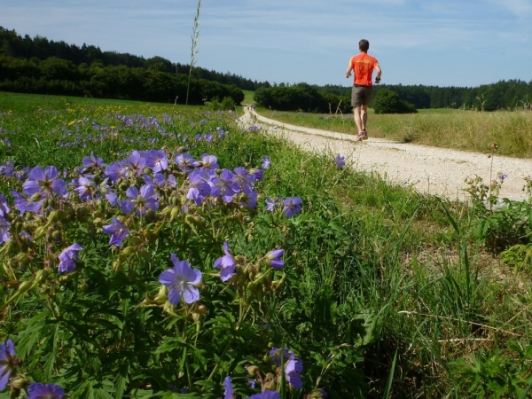 Viel Sauerstoff und nicht mehr so heiße Luft wartet auf uns im Pappenheimer Wald. Dass unsere Laufstrecke mitunter gefällig wird, freut mich umso besser. Und dann warten wieder kleine Einlagen: Schlammlöcher, umgestürzte Bäume und enge Passagen. Von hinten kommt ein Radler und lobt mich für mein Durchhalten. Er hat gerade eine Ruhephase, denn sein Partner in der Staffel ist weit voraus. Wir sind in unserem Ratsch vertieft und ich bekomme gerade noch im Augenwinkel mit, dass unser Kurs scharf rechts auf einen Buckelweg geht. Kurz vor Dietfurt laufen wir auf dem Altmühltal-Panoramaweg, Deutschlands schönstem Wanderweg. Das wurde in einem Wettbewerb vor zwei Jahren ermittelt.