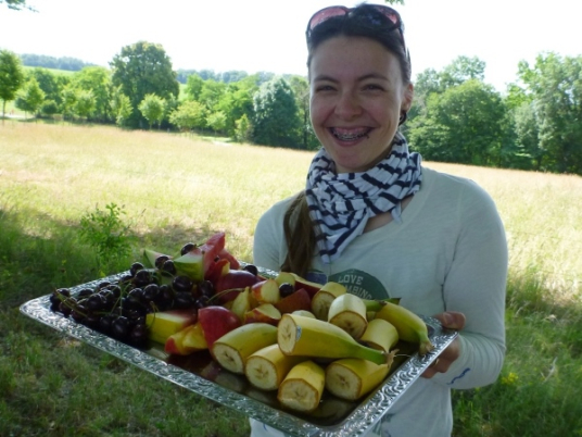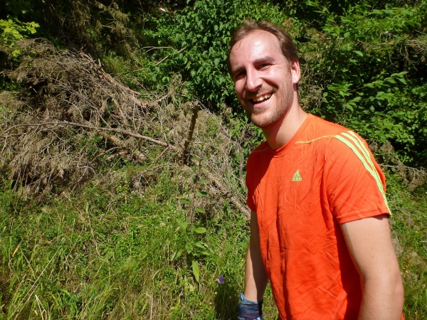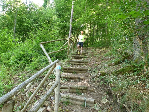 Oberhalb von Dietfurt hält mir ein Mädel ein Früchtetablett mit Bananen, Äpfeln, Melonen und Kirschen hin. Ich greife zu. Zum Nachtisch Obst! Am Vereinsheim des TSV Dietfurt, ein paar Meter weiter, hocken einige Sportfreunde beim Frühschoppen zusammen, fachsimpeln über die WM und was weiß ich. Dann zeigen sie mir den weiteren Weg, der über ungestüme Holztreppen und Wurzelpfade recht rustikal rund 50 Höhenmeter am Dietfurter Sommerhaus hinunter in den Ort führt.
