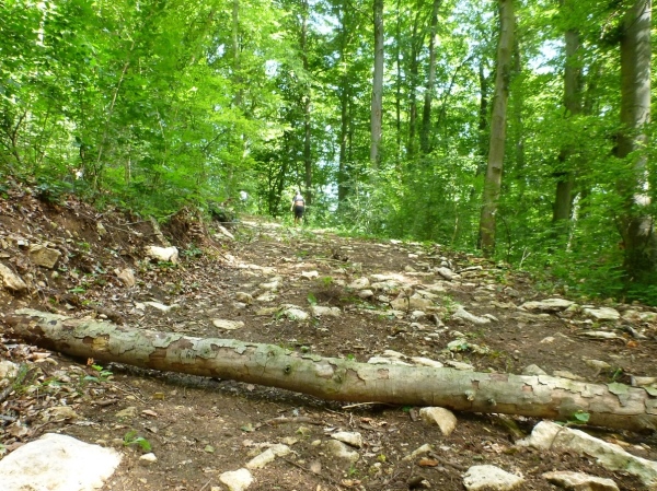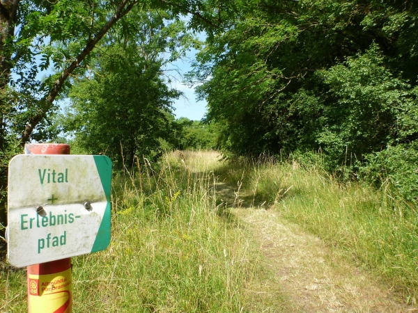 Am Waldrand fährt ein Trampelpfad direkt in den Wald hinein. Der Einlass ist fast nicht zu erkennen. Und da wartet die dritte Steigung am Burgstallberg mit rund 50 Höhenmetern auf kurzer Laufstrecke. Wie bekannt die Wegbeschaffenheit: Schmal, steil, mitunter steinig und ein Baum quer über den Weg. Zwei, drei Trailrunner sind zu Wanderern geworden, ich also vorbei. Oben könnte ich einen Abstecher zur Teufelskanzel machen, wo man einen herrlichen Blick über das Tal genießen könnte. Und wer nicht ausgelastet ist, den kann sich mit einigen Übungen auf dem Vital- und Erlebnispfad in Form bringen. Ich lasse die Übungen bleiben, die können ja die Wanderer machen, die es gemütlicher wollen.