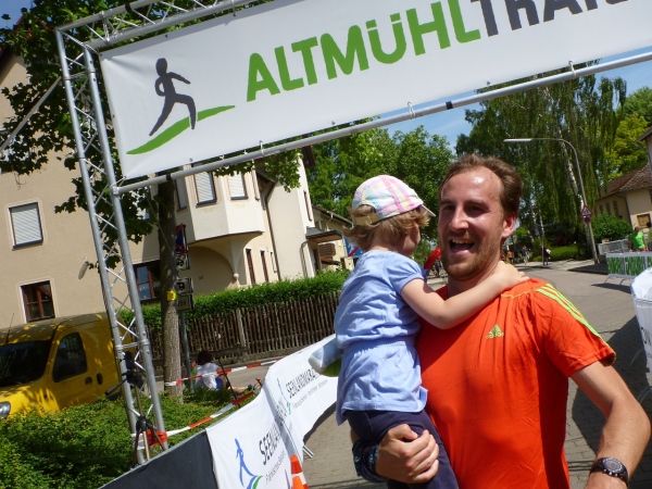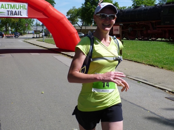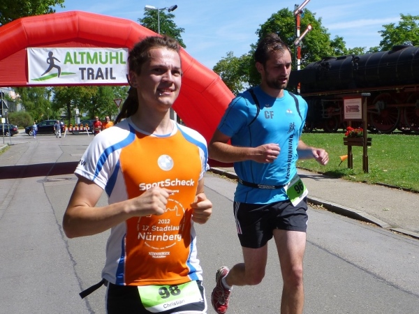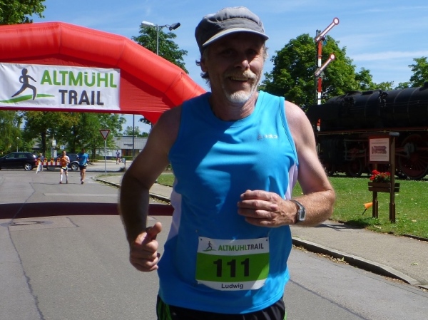 Ein paar Treppen bringen mich endgültig aufs Talniveau der Altmühl. Aus der Burgstall-Quelle, gleich nebenan, wird die Altmühltherme mit Wasser versorgt. Aus 800 Meter Tiefe kommt das Aqua, es soll wie ein Jungbrunnen wirken. Eine Holzbrücke führt mich über die Altmühl und am Ende wartet Andy Ettinger, ein Vereinskollege, der mich zum Ziel begleiten will. „Da an der Brücke, zieh den Kopf ein, sonst gibt es einen Dachschaden.“ In der Unterführung der Hauptstraße können nur Menschen unter 1,70 Meter Größe aufrecht durchmarschieren. Wir laufen schließlich noch zwei Linkskurven, an der Denkmalslok vorbei und d ins Ziel.