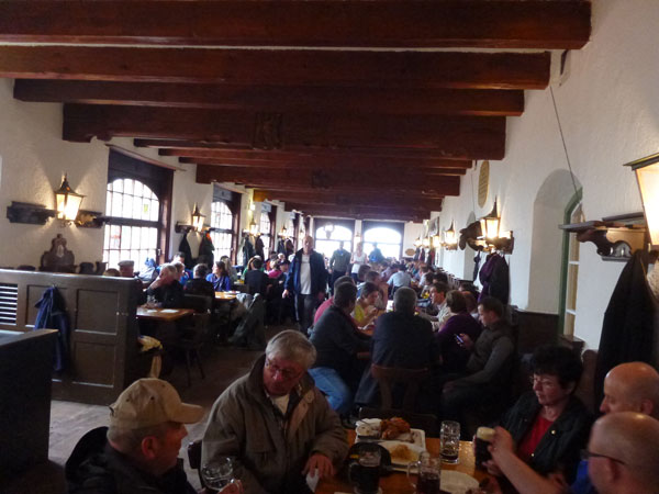 Direkt unter den Klostermauern und gegenüber des Bräustüberls ist der Trail beendet. Die Aussicht hat heute gefehlt, die Strecke war aber wieder ohne Fehl und Tadel. Der stetige Wechsel von auf und hat wieder riesen Spaß bereitet. Leider kann man sich bei dem garstigen Wetter nicht besonders lange im Zielbereich aufhalten. Obst, Kuchen, warme Getränke und auch eine Auswahl der Klosterbrauerei stehen zur Verfügung. Besser schmeckt’s uns nach einem Kleiderwechsel direkt im warmen Bräustüberl, denn der Besuch gehört selbstverständlich auch dazu.