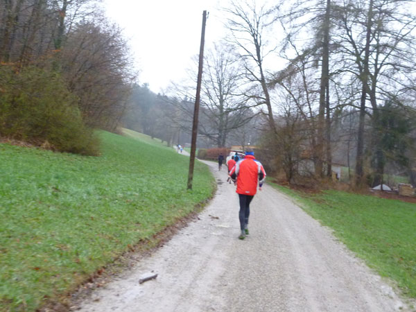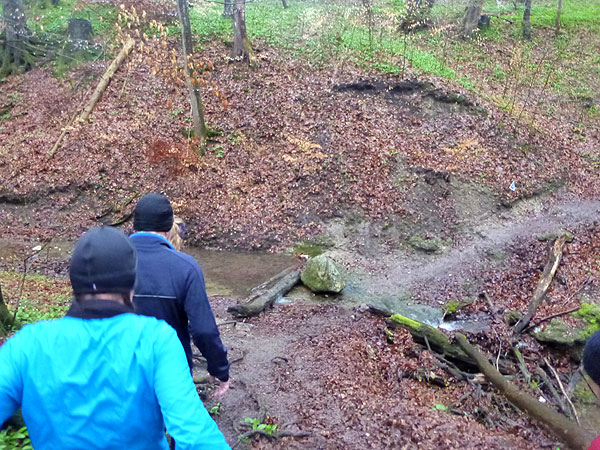 Optischer und sportlicher Höhepunkt ist sicherlich die Passage durch den Ochsengraben. Eine Senke führt uns mit einem kurzen steilen Ab- und sofortigen Wiederaufstieg über einen schmalen Bach. Für die „Experten“ folgt eine fast zwei Kilometer lange Downhill-Passage auf einem gut zu laufenden Waldweg. 70 Höhenmeter verlieren wir dabei, hinunter zum tiefsten Punkt des Kurses, fast bis an den Ortsrand von Herrsching. Zwischendrin bei etwa km 9 erfolgt die Streckentrennung. Die Läufer auf dem kürzeren Trail haben ab hier noch ein guten Kilometer bis ins Ziel.