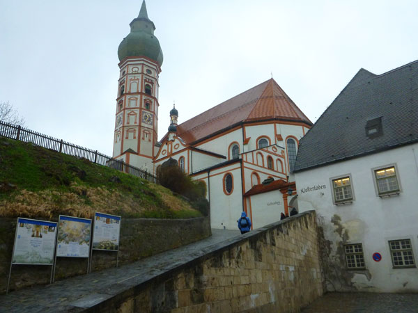 Noch fehlen uns 2,5 km bis zum Zielbogen im Klosterhof. Der letzte Aufstieg beinhaltet nochmals 120 Höhenmeter. Stetig ansteigend führt dabei der Weg, oft recht wurzelig und matschig, nach oben. Ein paar Asphaltmeter und ein erneutes kurzes Gefälle müssen am Ortsrand von Andechs hinter uns gebracht werden. Mit Blick auf die Wallfahrtskirche St. Nikolaus und Elisabeth beginnt das furiose Finale über steile Treppen hinauf auf den Heiligen Berg.