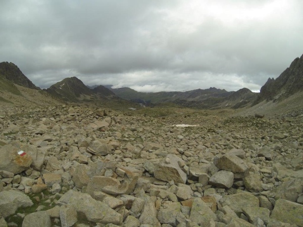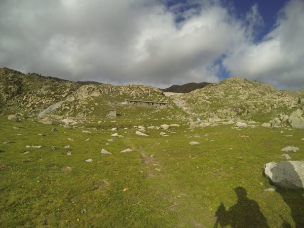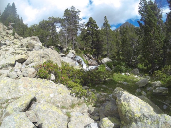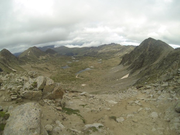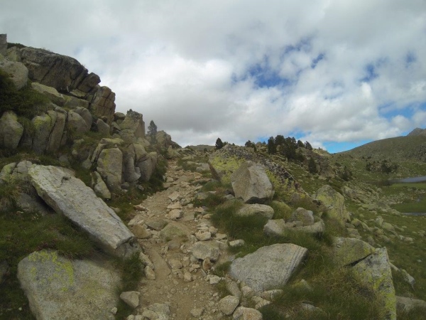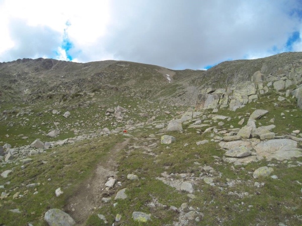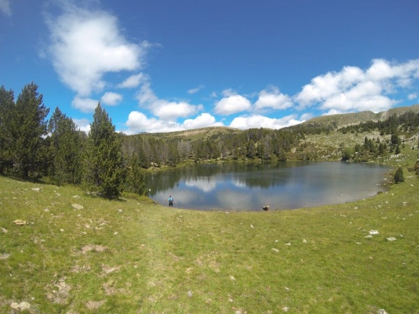 Und es ist heiß geworden. Wir haben über 20°Grad, die Sonne brennt auf den Kopf, der eine oder andere Bachlauf wird zum Erfrischen genutzt oder auch nur zum Befeuchten der Mütze. Auf und ab, immer wieder, mühseliges Höhenmeter sammeln, aber das Landschaftsbild hat sich am Nachmittag geändert. Gegenüber der sehr schroffen Felslandschaft im Nordwesten von Andorra, haben wir nun sehr schöne Almwiesen und Bergseen um uns herum.