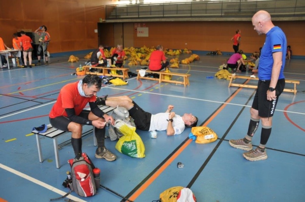 Erholungspausen und Teamgeist von unserer deutschen 3er Gruppe. Unser Hauptziel sieht nach wie vor: gemeinsam gestartet, gemeinsam ins Ziel kommen, wenn es das Zeitlimit zulässt. Die Cut-off-Zeit-Schwelle ist weit hinter uns, so können wir bequem durch die Nacht marschieren.