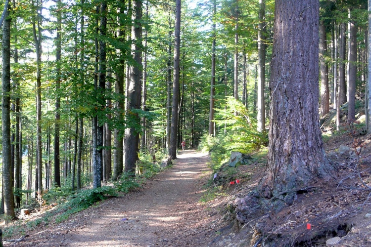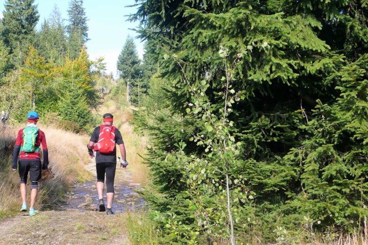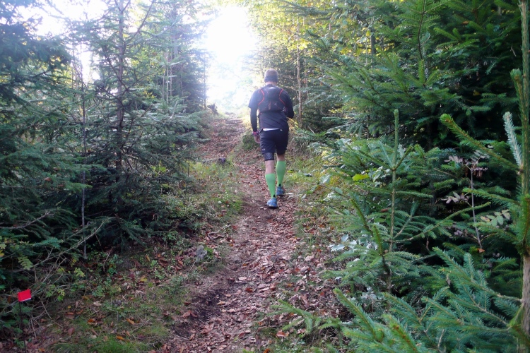 An der Glashütte liegt VP2. Trubel ringsum, alles bunt, seltsame Gewächse im Unterholz und ein Pumuckl. Hier ist was los. Aber nun: direktemang zum Arber, dem Kleinen erstmal. Nur hoch, denn die Glashütte liegt etwa auf Startniveau: 689m. Auf 1384 müssen wir jetzt. Dann man tau. Der Pfad wird zum Weg, der Weg wird zum Pfad. Links, später rechts, rauscht ein Bach. Einzelne Wanderer begegnen uns. Die Sonne bricht durch das Herbstlaub, eine angenehme Wärme hüllt uns ein. Von rechts stößt der Auerhahntrail zu uns, die nächsten 30 km haben wir dieselbe Strecke. Dieser Trail hat 35 km und steigt direkt zum Arber auf. Mindestens ebenso lohnend. Aber die erste Hälfte des Ultra hat enorm viel supertollen Trail zu bieten und die großen Highlights kommen erst noch.