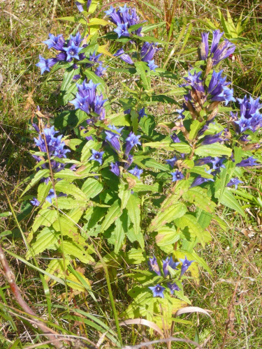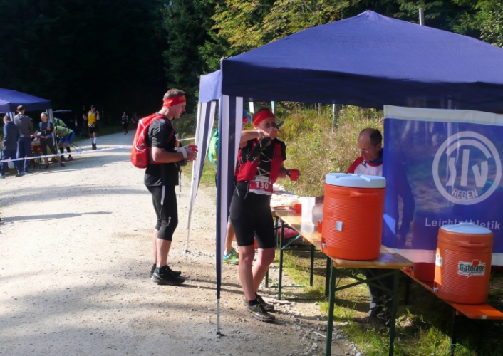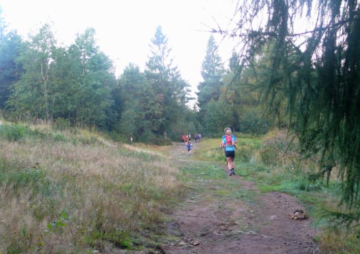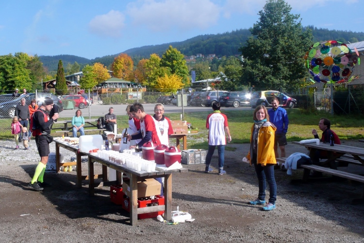 Eine Wasserstelle, bemannt- nein, befraut mit supernetten Helferinnen. Genau das Richtige zur Motivation und Stärkung der Moral bei den gemächlicheren Trabern. Die Pause tut gut. Zum Kleinen Arber ist es nicht mehr weit. Der Anblick flößt Respekt ein: Plötzlich taucht die Kuppe auf, hoch und unendlich weit weg, Wald obendrauf und winzige bunte Punkte, die darin verschwinden. Das kann ja was werden, denke ich. Aber alles halb so schlimm. Durch eine kahle Graslandschaft mit vielen Baumleichen und toller Aussicht gehts schnell in Serpentinen aufi, ie in den Alpen. Und Ruckzuck ist man oben.